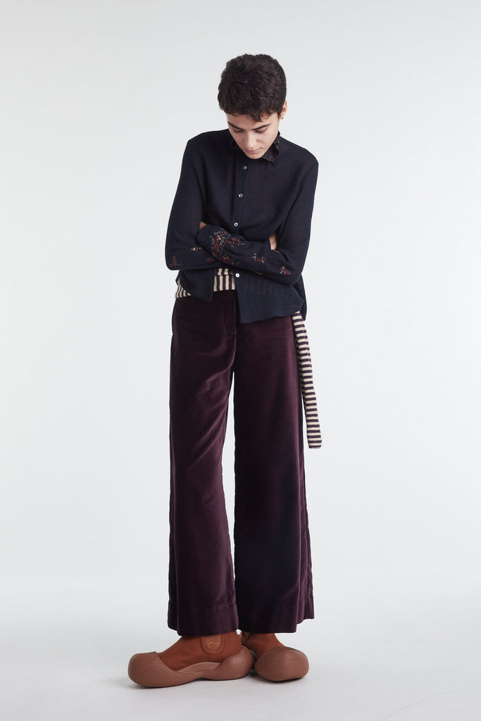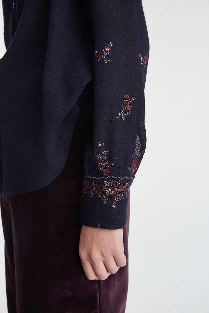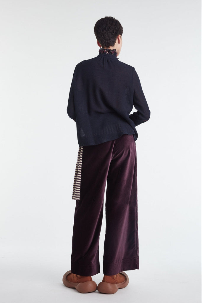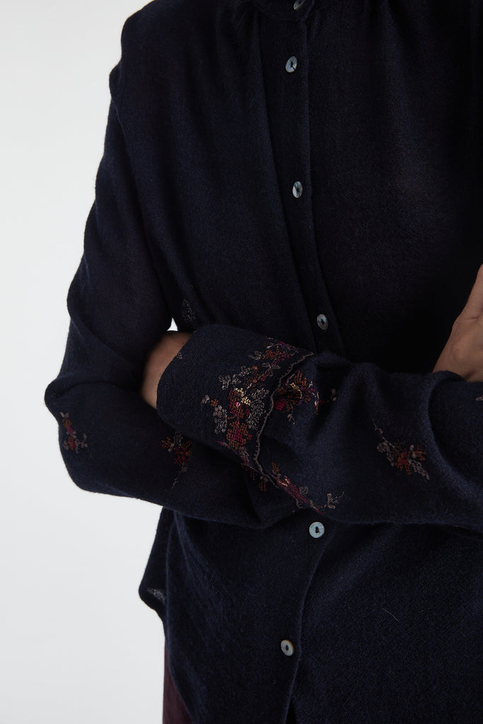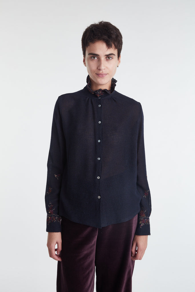 Long sleeve flared shirt in crisp black Japanese cotton: high ruffle collar, decorative pleats at the base of the collar on the front and back, fastening with 7 mother-of-pearl buttons, round cuff with pleats and slit closed with a button.