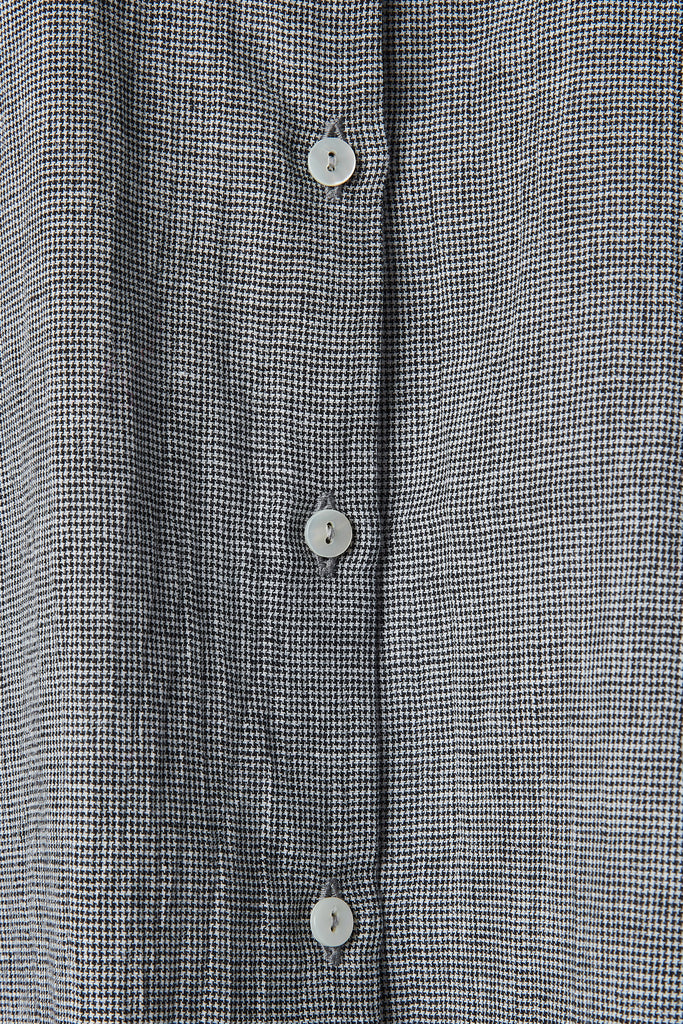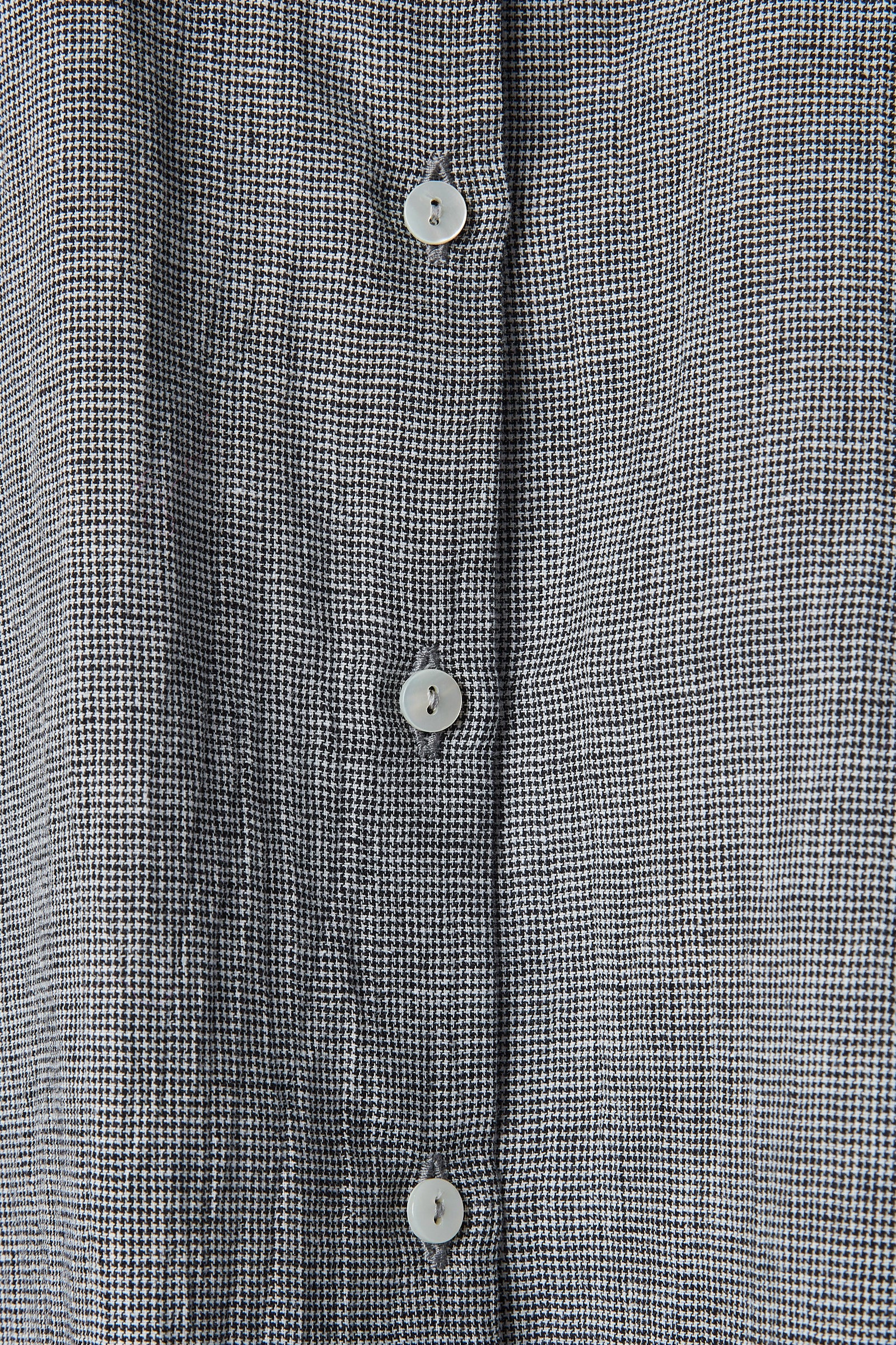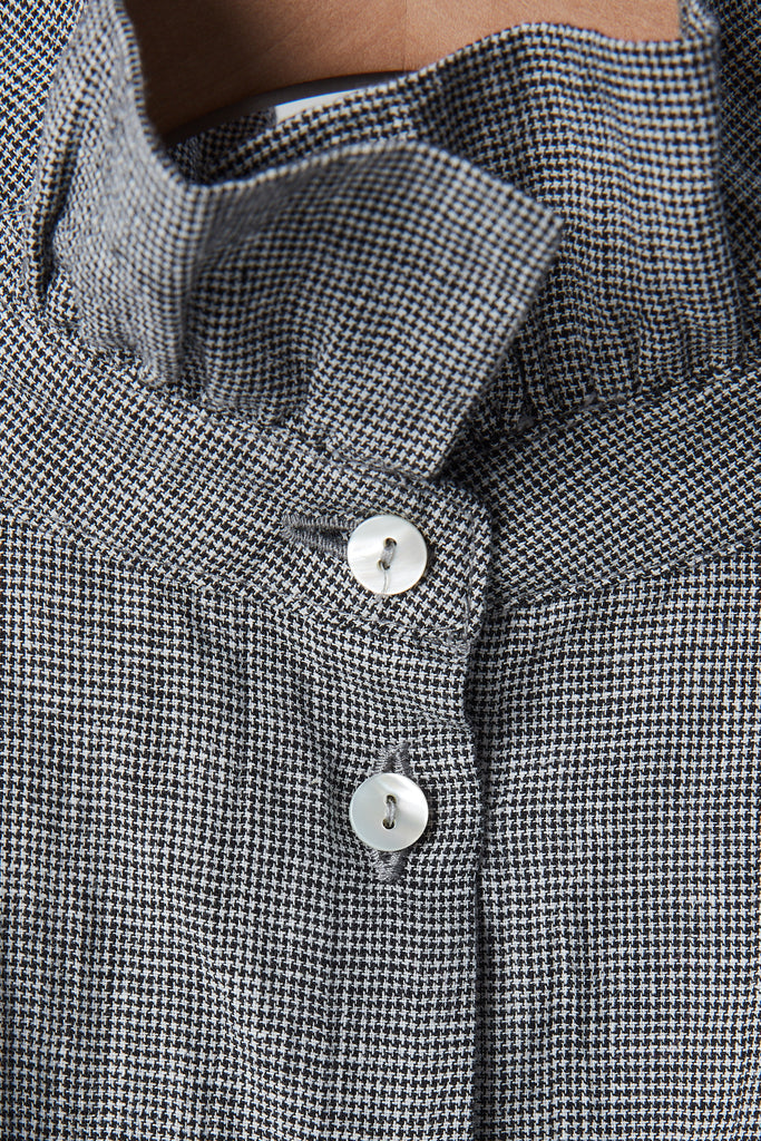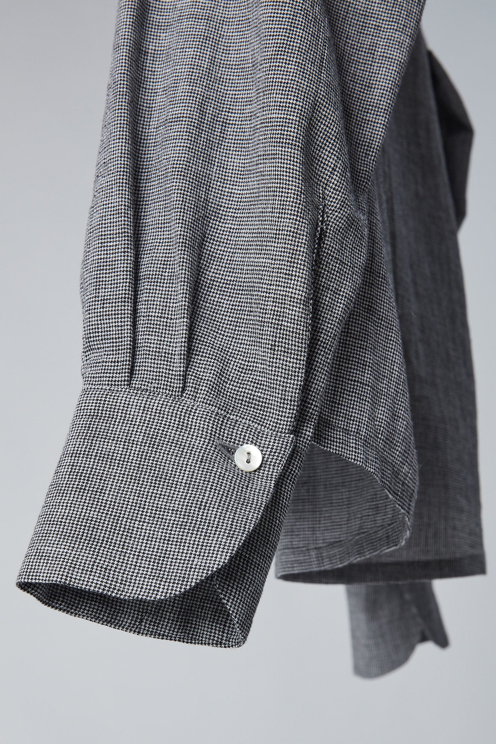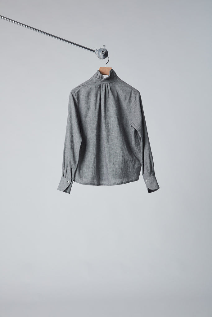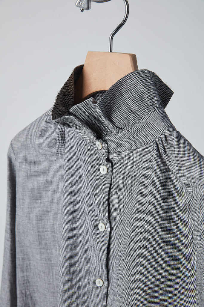 Long sleeve flared shirt in crisp black Japanese cotton: high ruffle collar, decorative pleats at the base of the collar on the front and back, fastening with 7 mother-of-pearl buttons, round cuff with pleats and slit closed with a button.