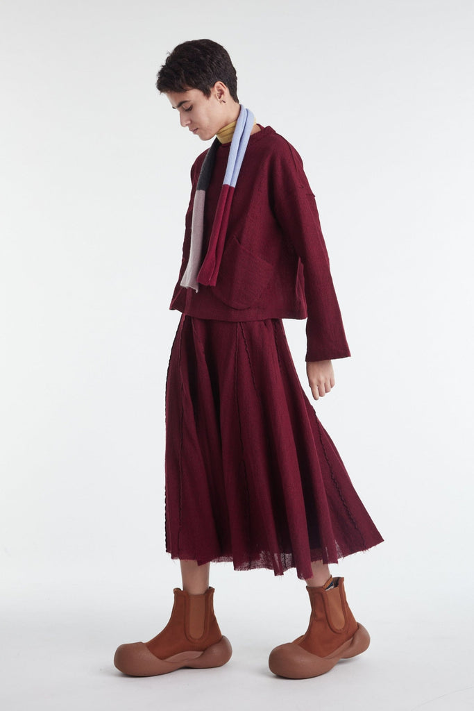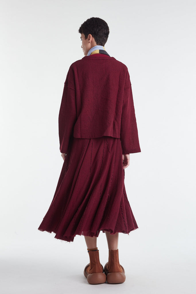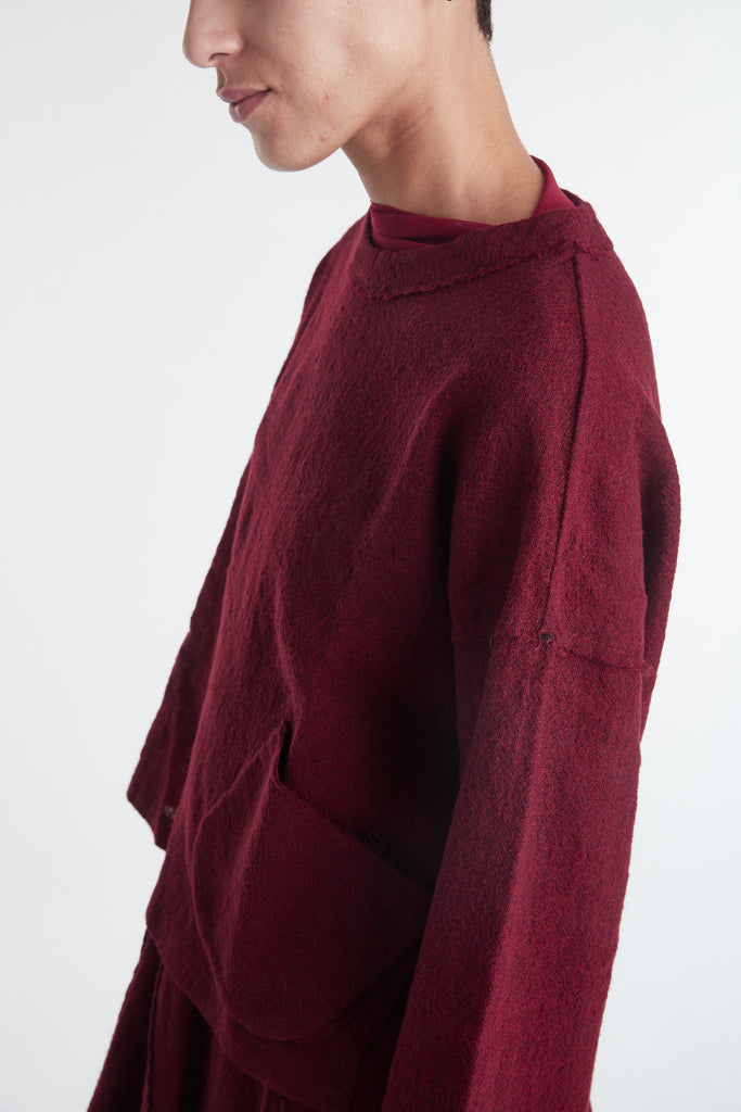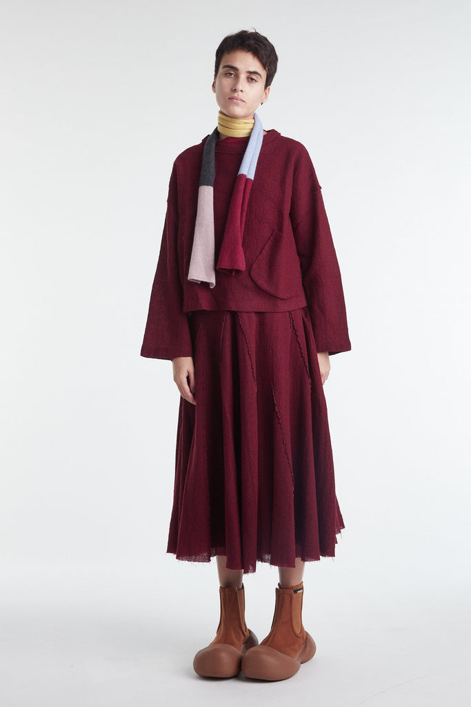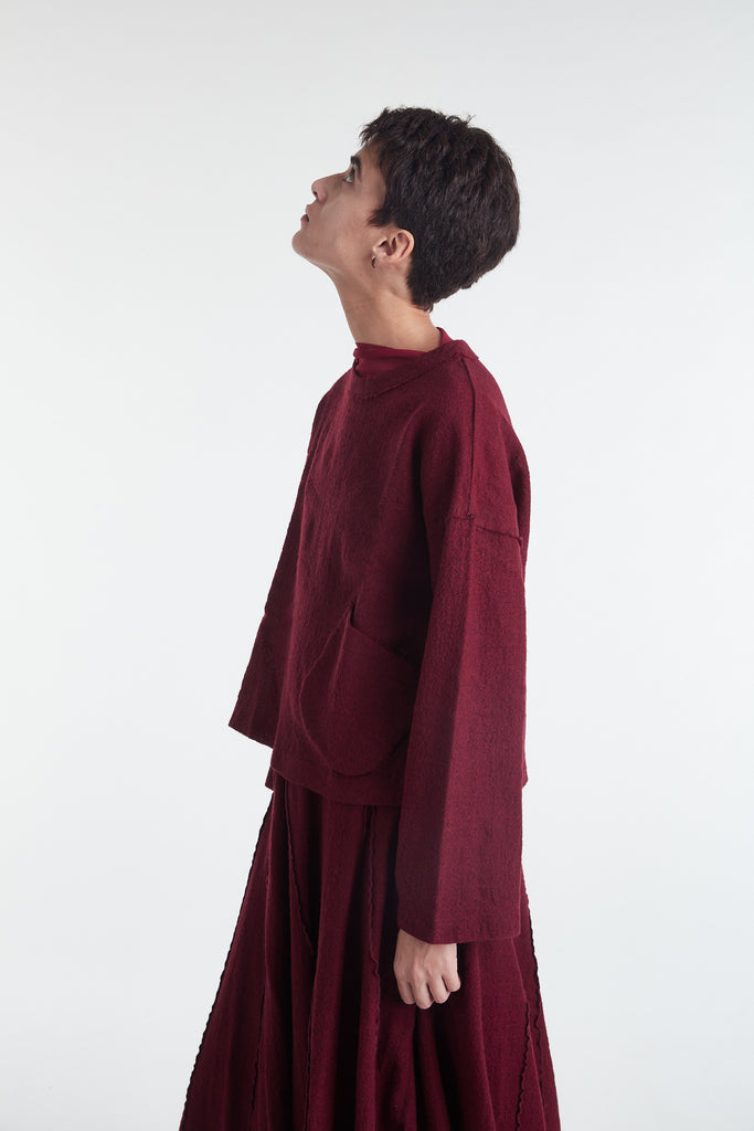 Warm brown Japanese stretch tulle long sleeve top: curved stand-up collar secured at the sides with bar tacks, all edges left raw cut.