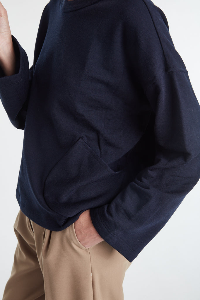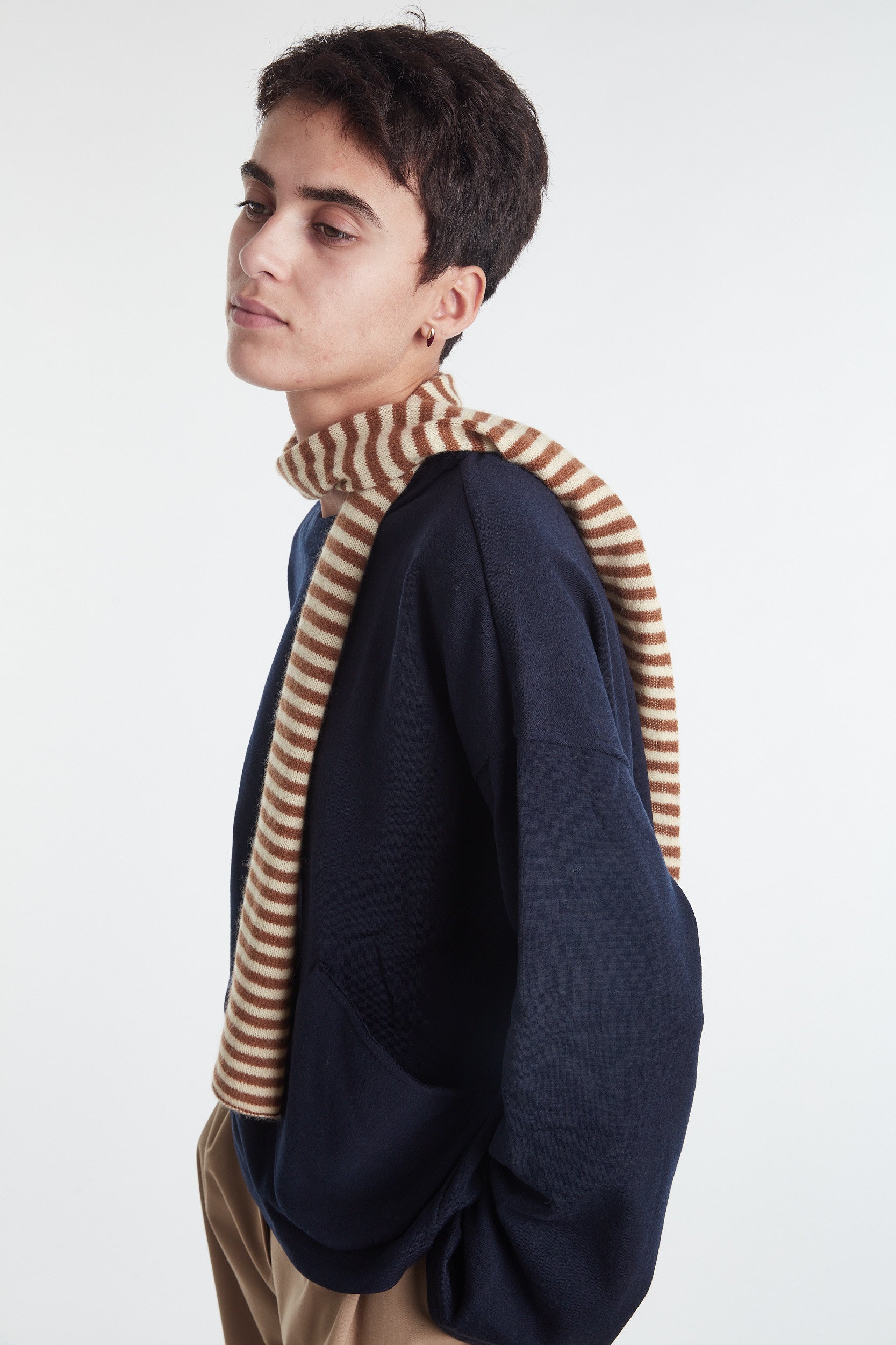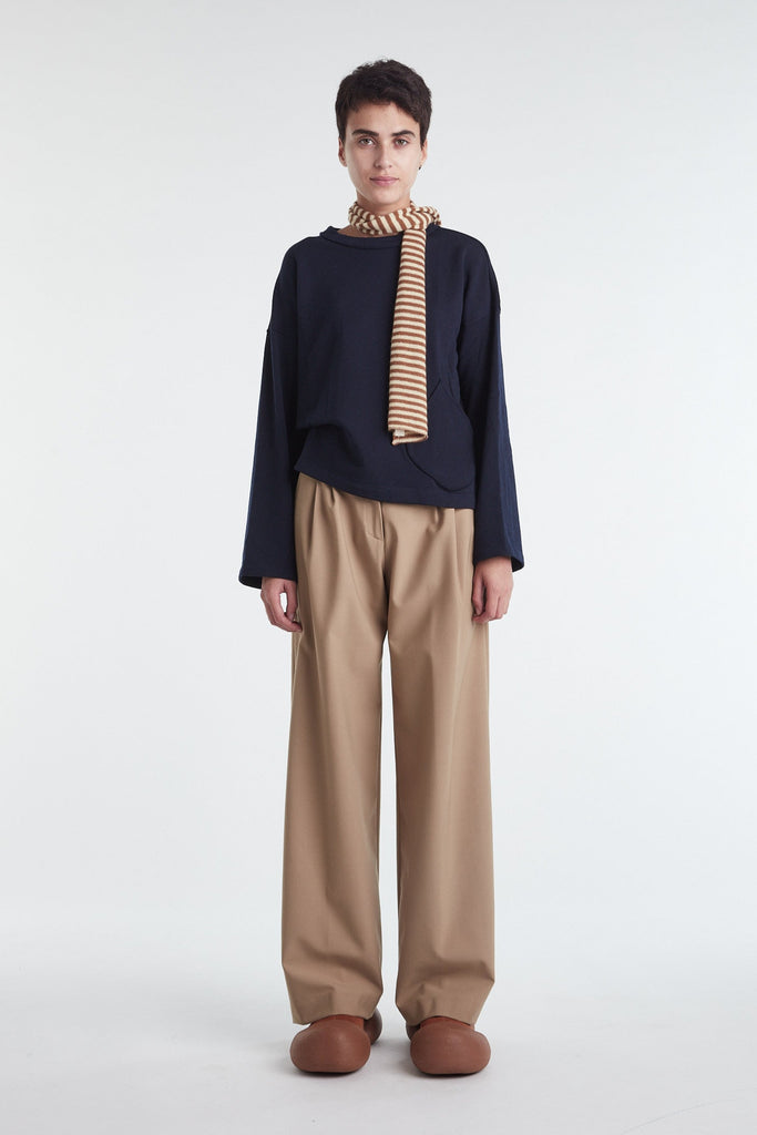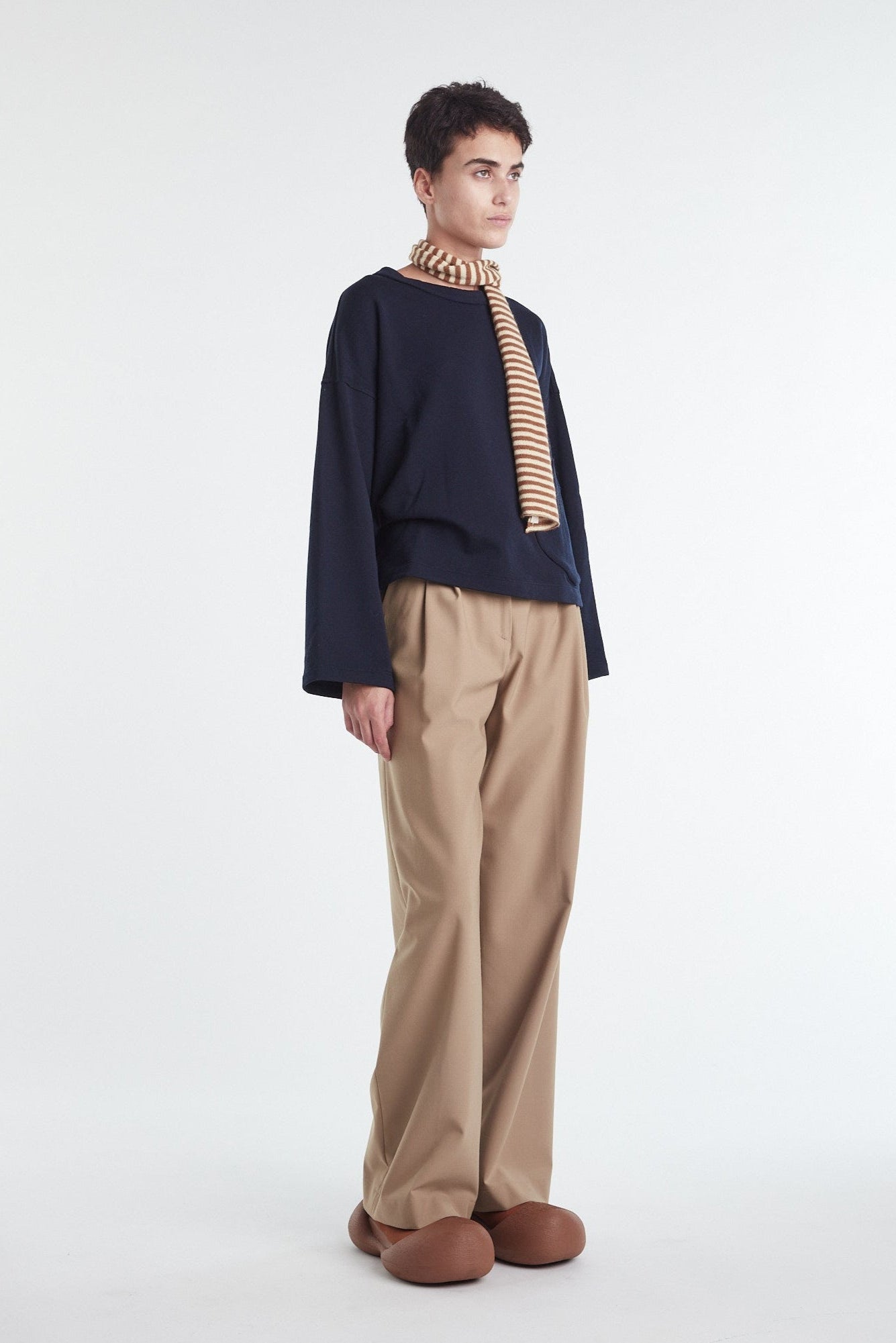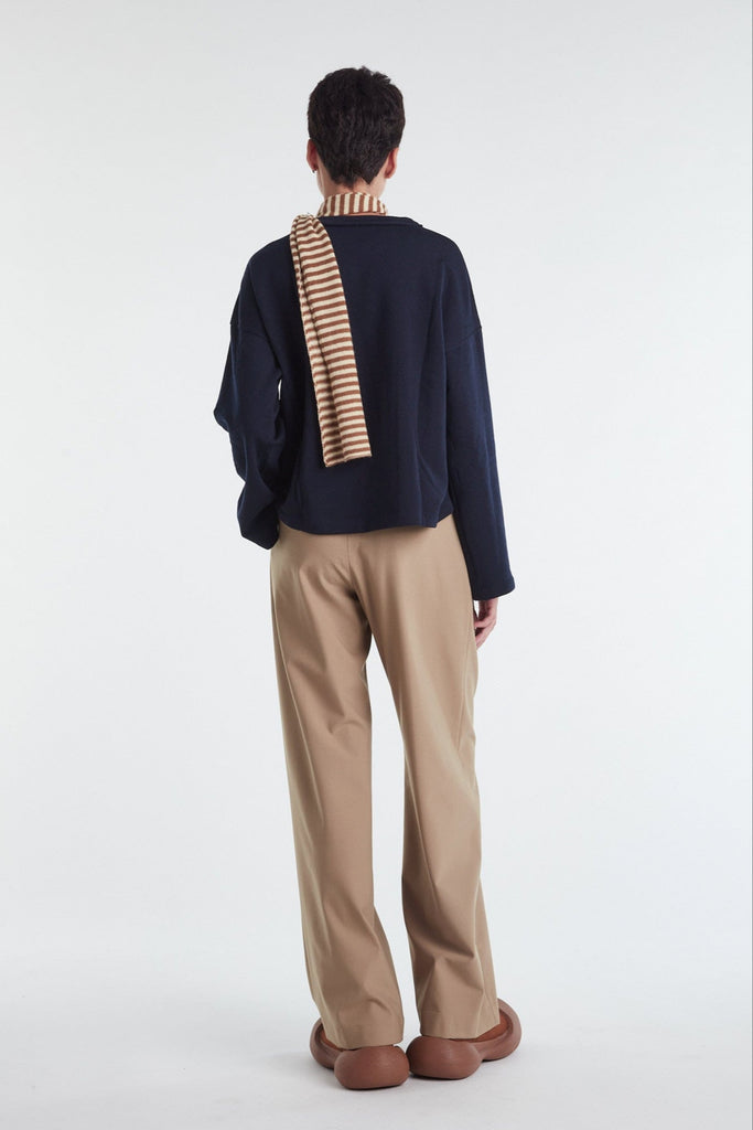 Warm brown Japanese stretch tulle long sleeve top: curved stand-up collar secured at the sides with bar tacks, all edges left raw cut.