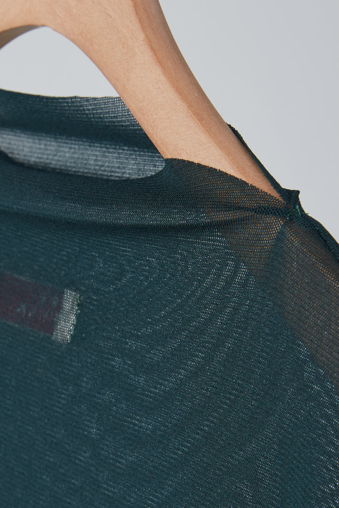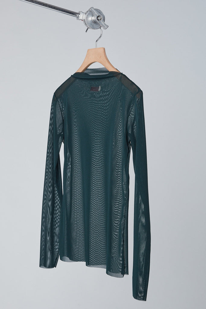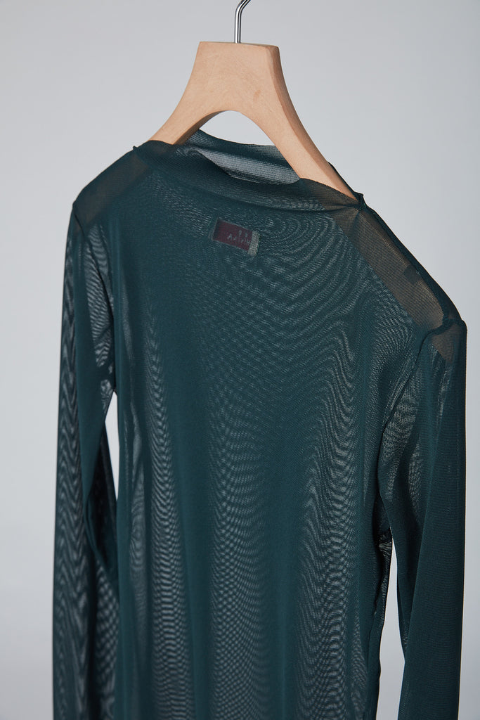 Warm brown Japanese stretch tulle long sleeve top: curved stand-up collar secured at the sides with bar tacks, all edges left raw cut.