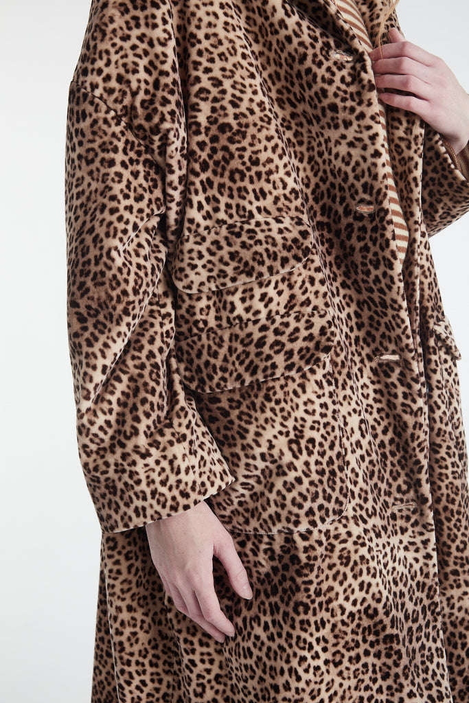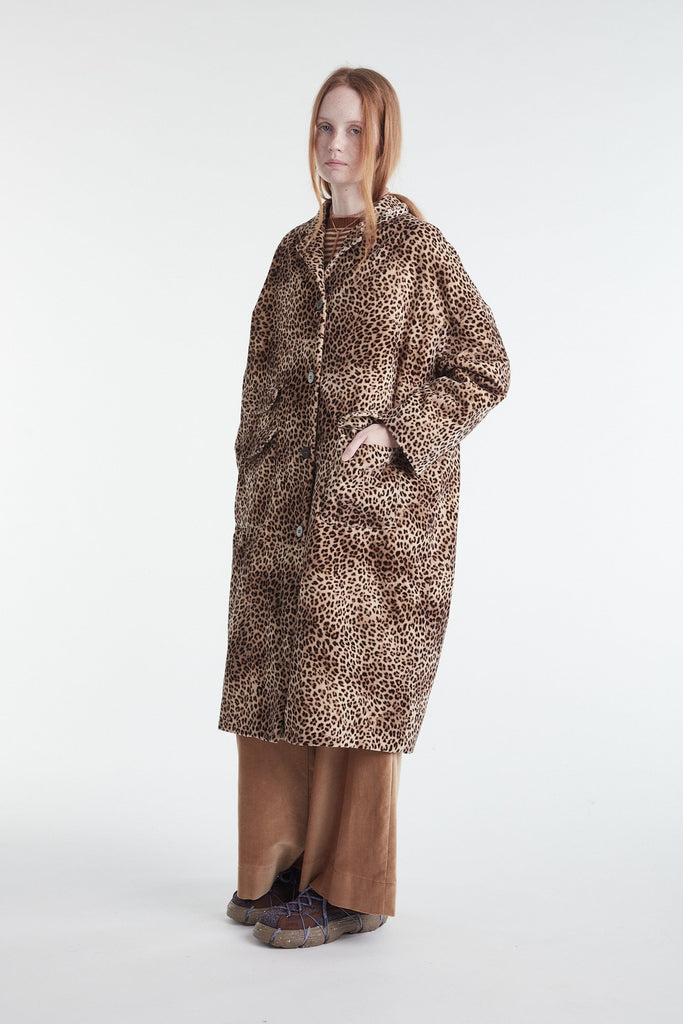 Long oversized egg-shaped coat, in midnight blue Japanese wool cloth: dropped shoulder, wide lapel collar, central fastening with 5 buttons, 2 patch pockets with flap and a high decorative flap applied on the right side, small slit, high sleeve hem. Cotton body lining, cotton blend sleeve lining.
