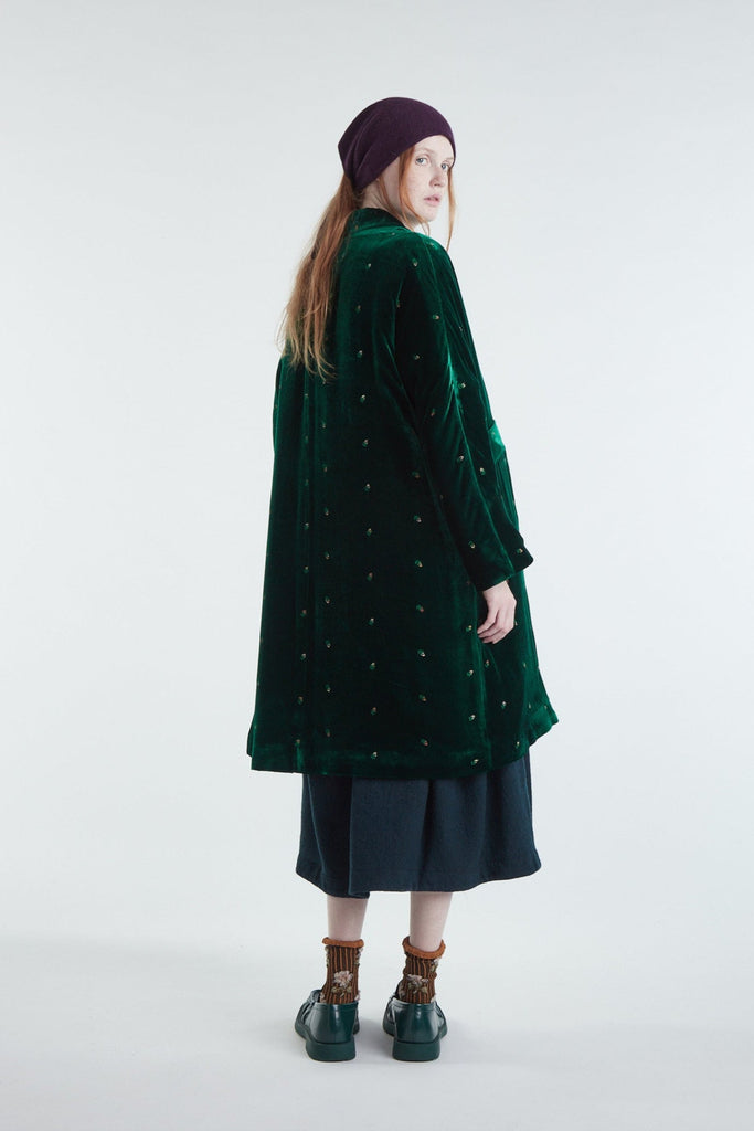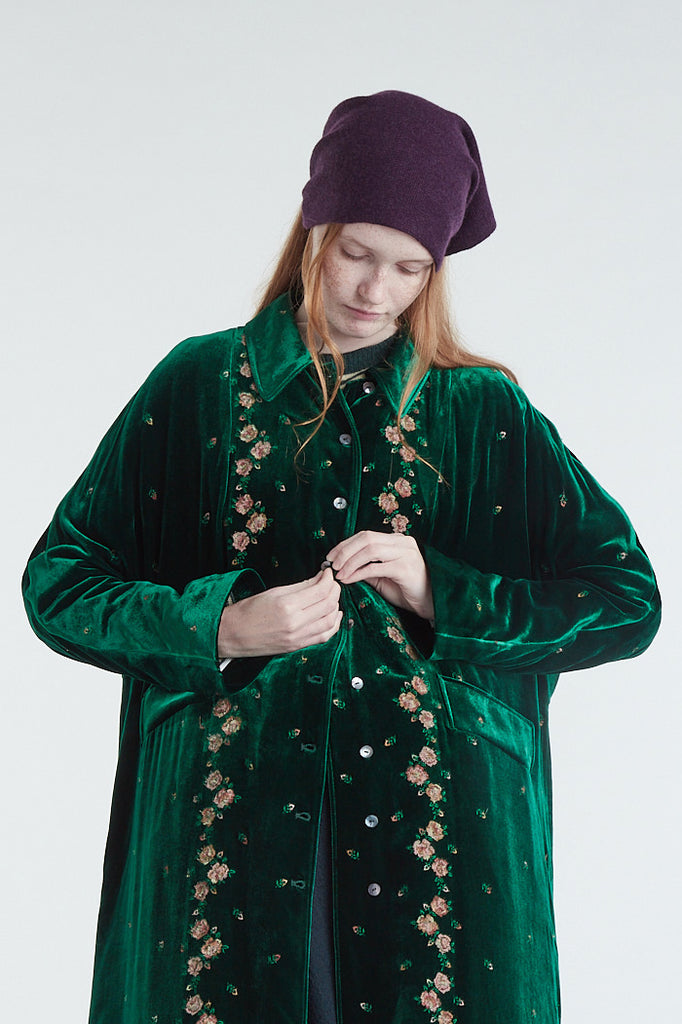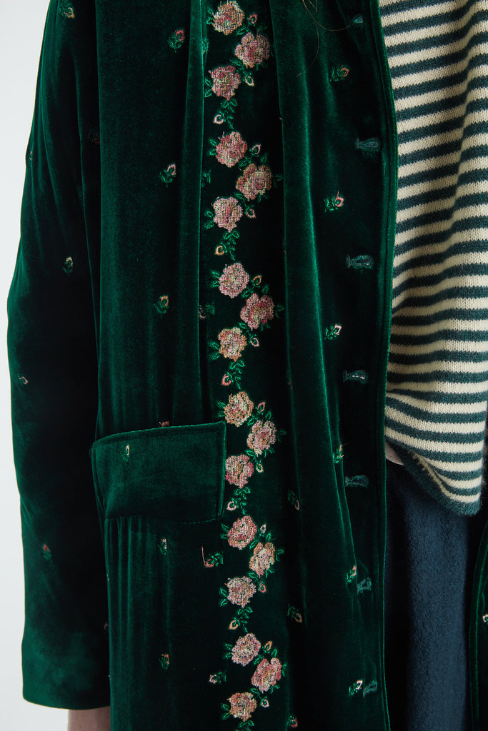 Flared coat in smooth rust orange velvet with floral embroidery: small pointed collar, kimono sleeve, diagonal welt pockets with high edge, central fastening with 10 small mother-of-pearl buttons, plus a small button with a loose buttonhole in cotton under the collar. Lined in a cotton blend and padded with original Thermore.