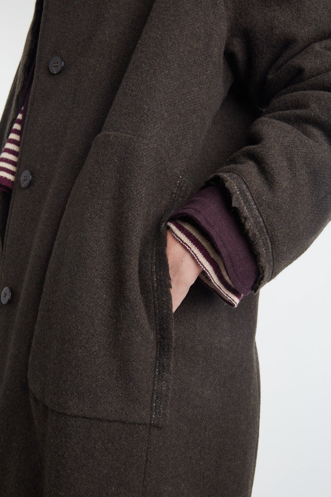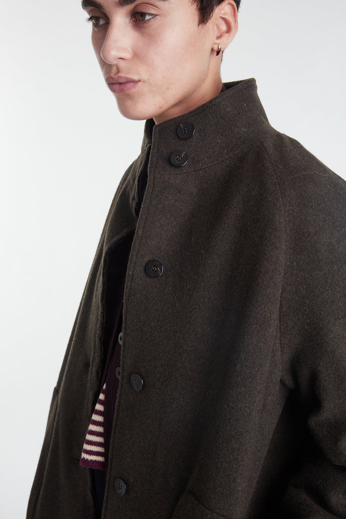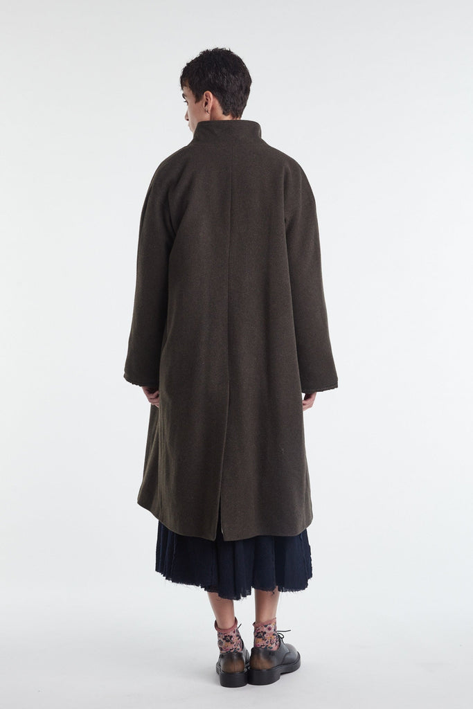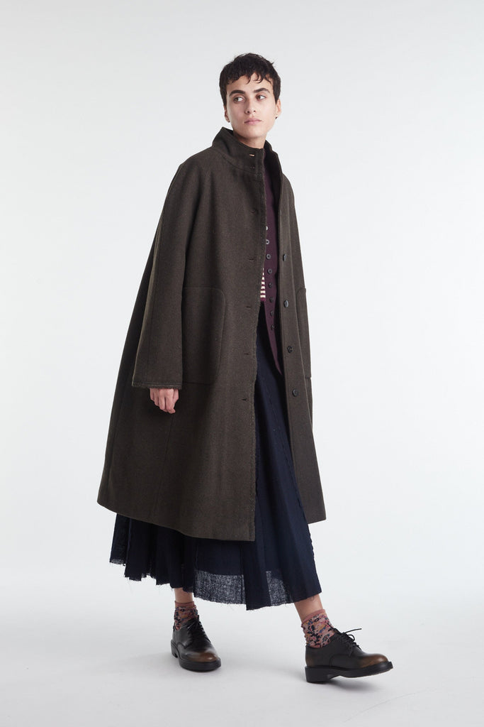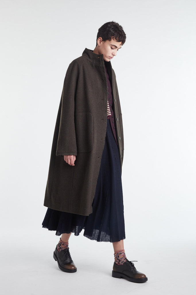 Long oversized egg-shaped coat, in midnight blue Japanese wool cloth: dropped shoulder, wide lapel collar, central fastening with 5 buttons, 2 patch pockets with flap and a high decorative flap applied on the right side, small slit, high sleeve hem. Cotton body lining, cotton blend sleeve lining.