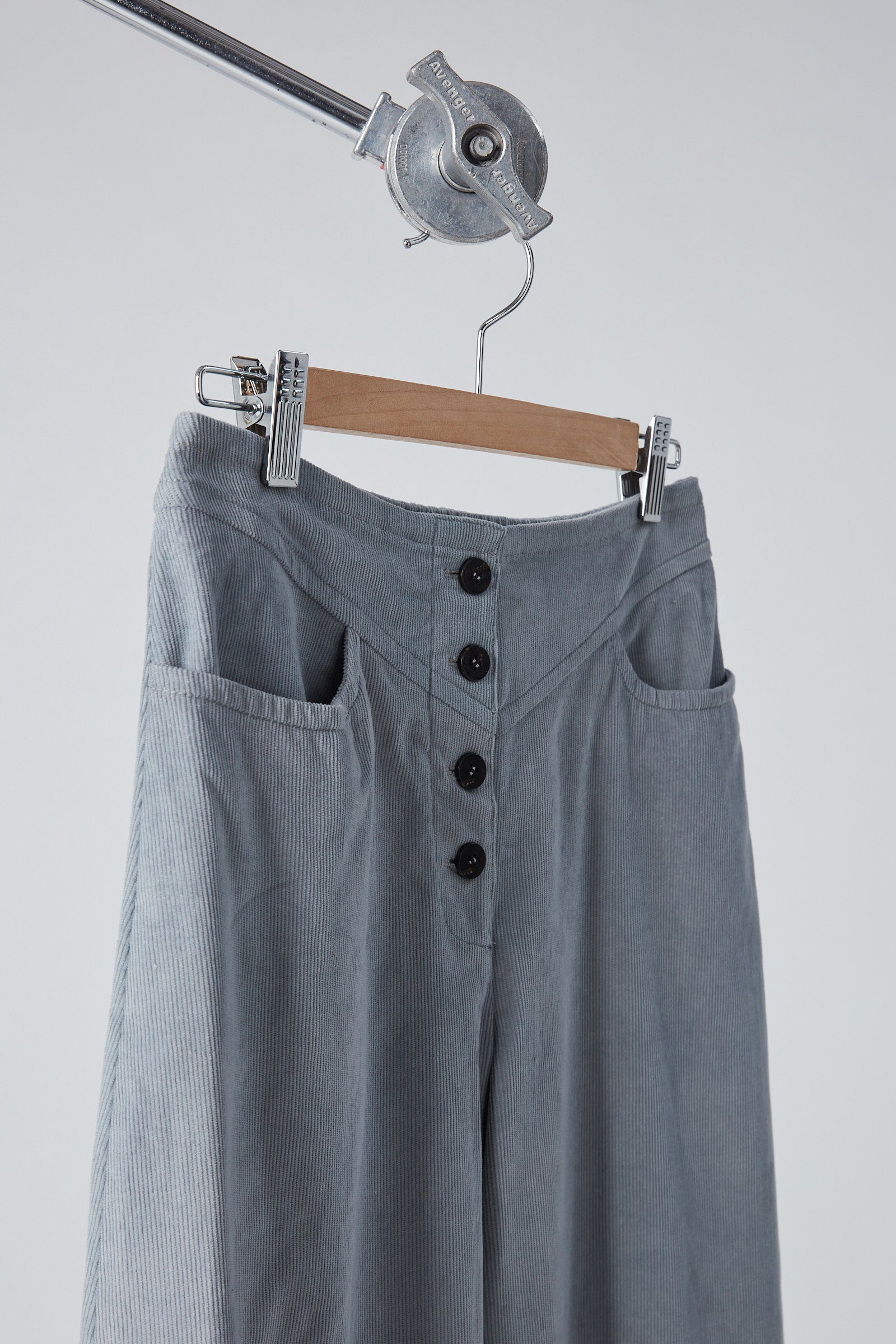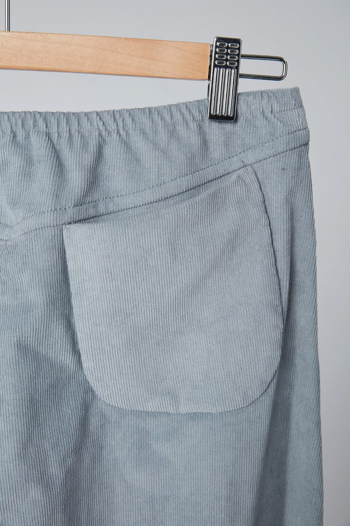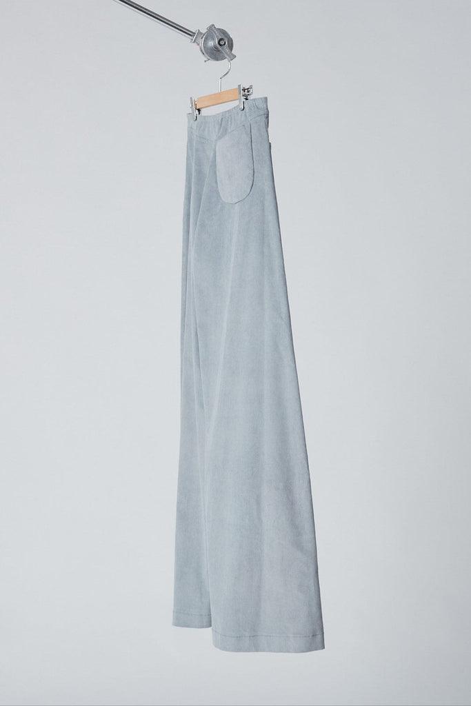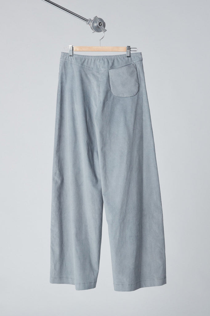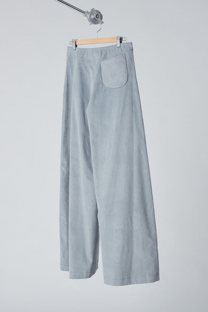 High-waisted flared trousers in stretch cotton drill, garment-dyed in turmeric: wide, slightly trapeze-shaped leg, waistband with belt loops and button, internal zip, side pockets sewn into the side, single rear welt pocket, high hem at the bottom.