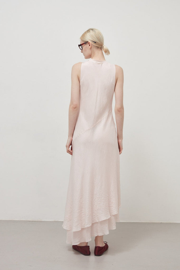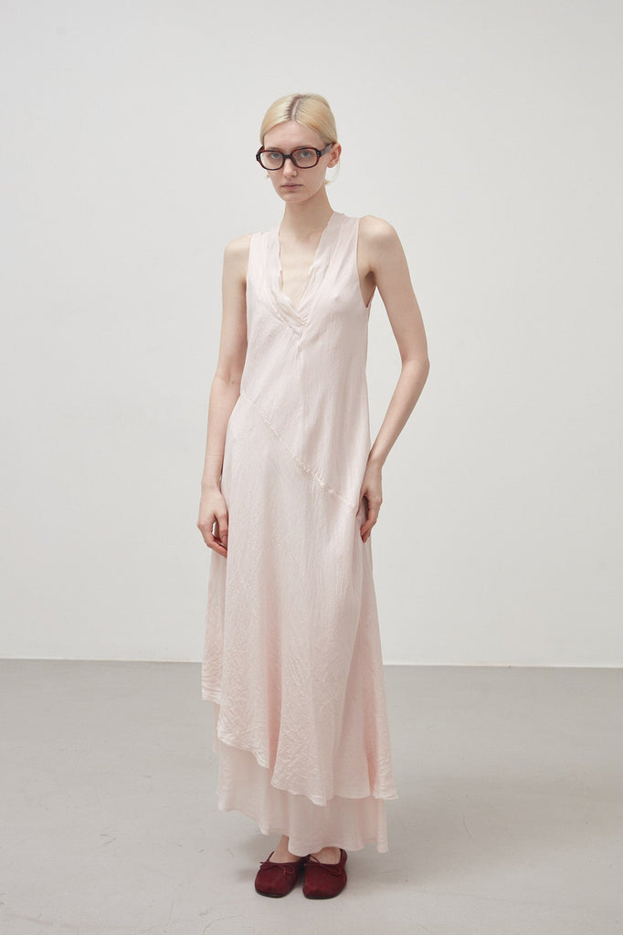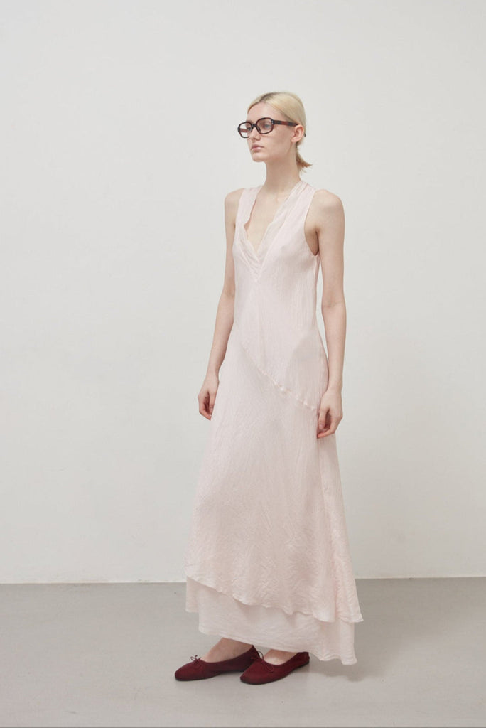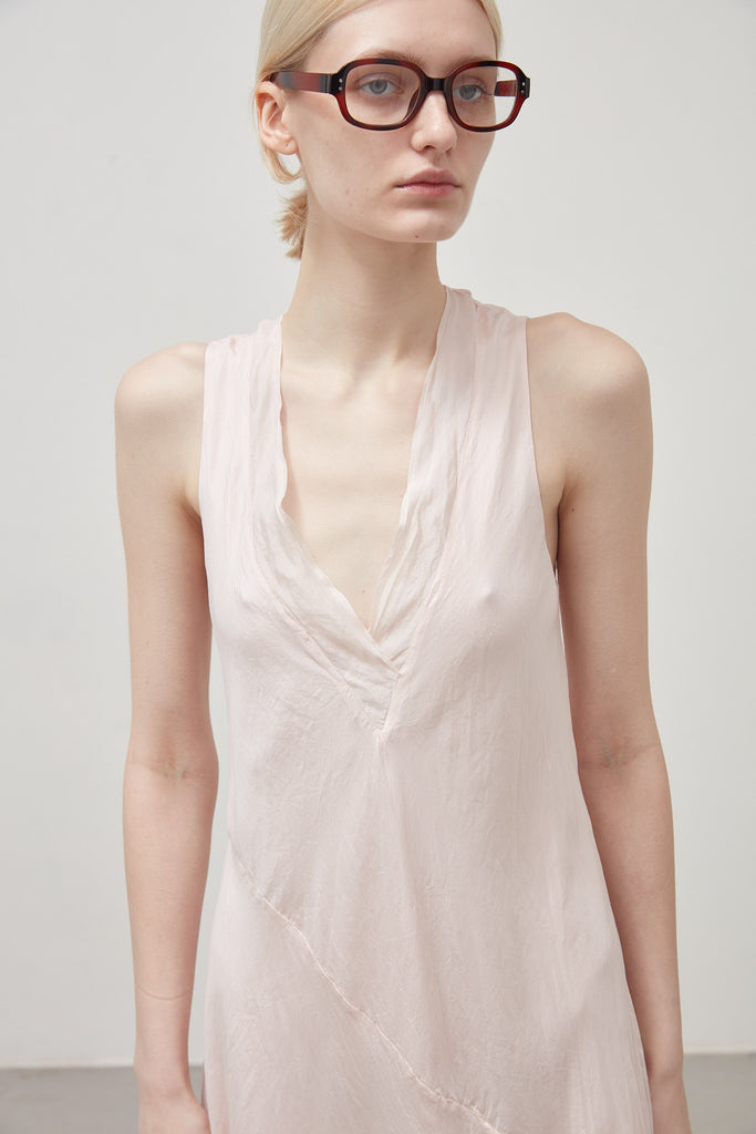 Long bias-cut, sleeveless dress in sepia pink garment-dyed habotai silk: flared cut, deep V-neck, halterneck straps, diagonal cut separating bodice and skirt, asymmetrical length at the bottom, raw cut at the neckline and bottom. The dress is composed of two overlapping layers of habotai silk with different weights that create a dynamic play of transparencies and stratifications.
