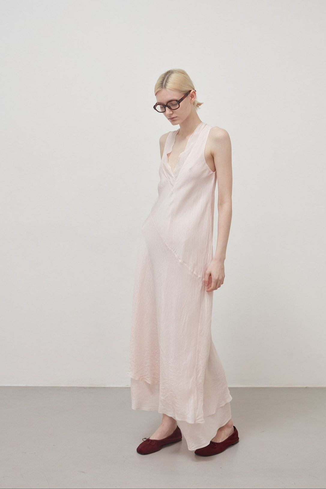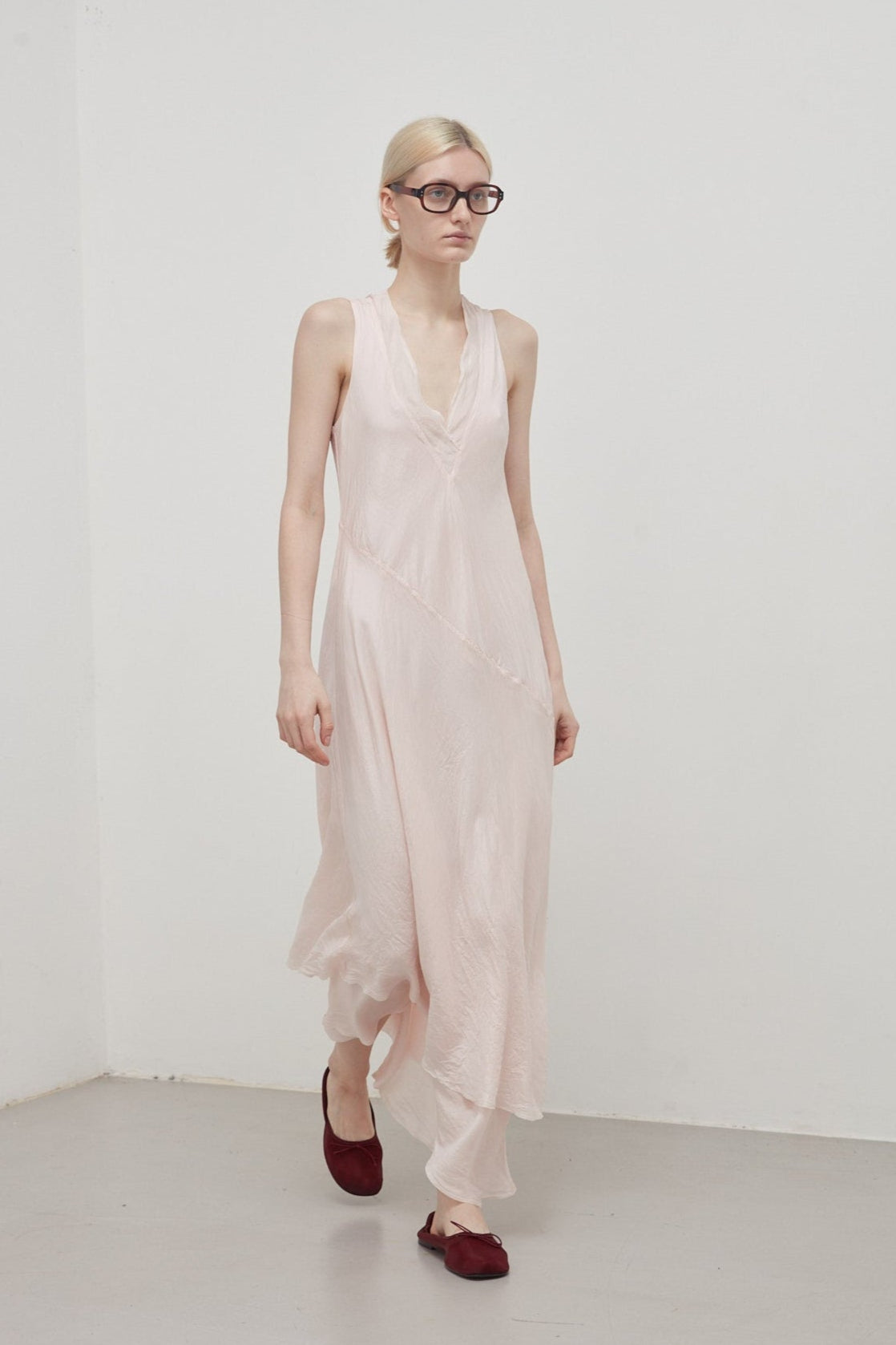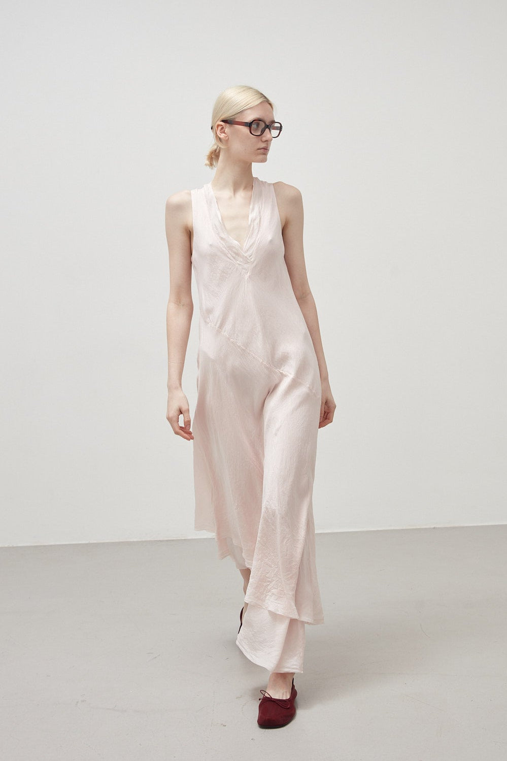 Long bias-cut, sleeveless dress in sepia pink garment-dyed habotai silk: flared cut, deep V-neck, halterneck straps, diagonal cut separating bodice and skirt, asymmetrical length at the bottom, raw cut at the neckline and bottom. The dress is composed of two overlapping layers of habotai silk with different weights that create a dynamic play of transparencies and stratifications.