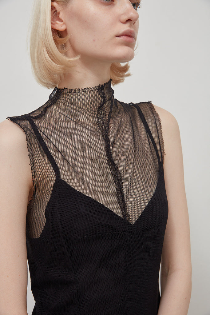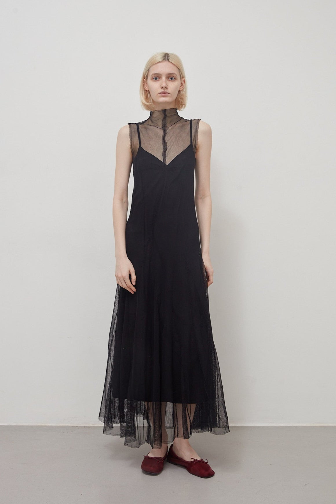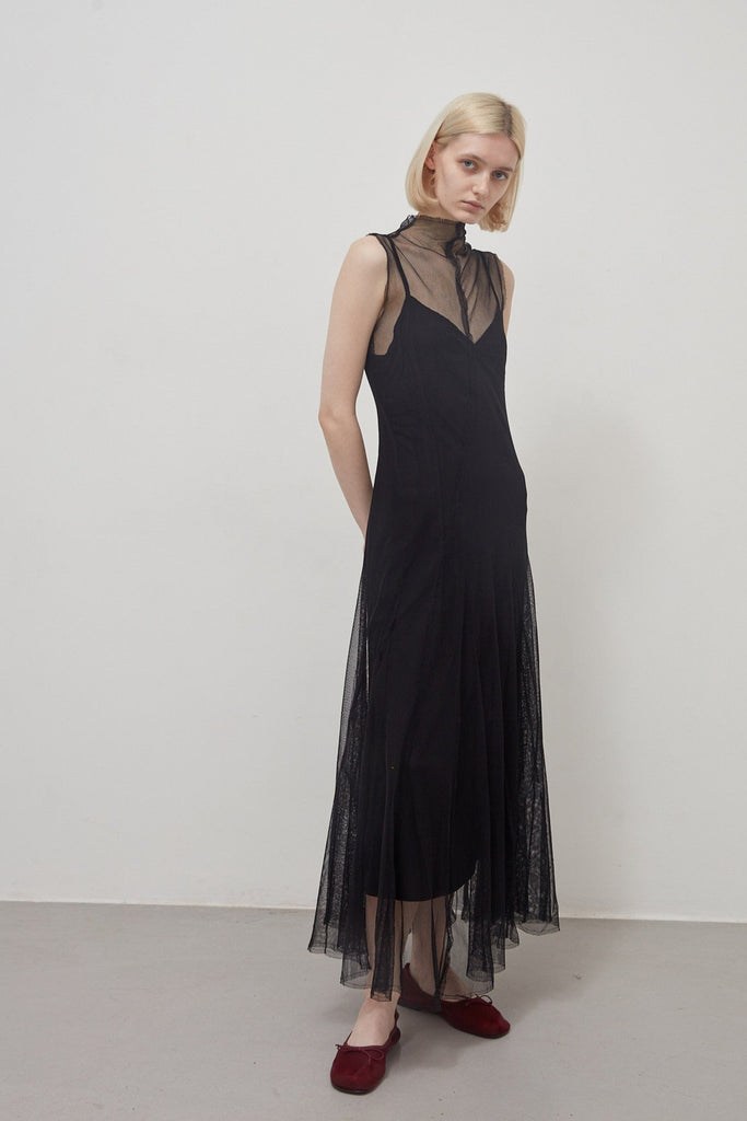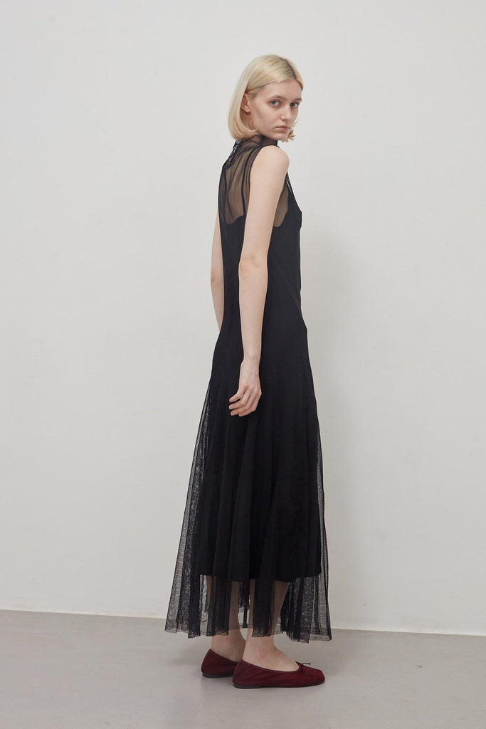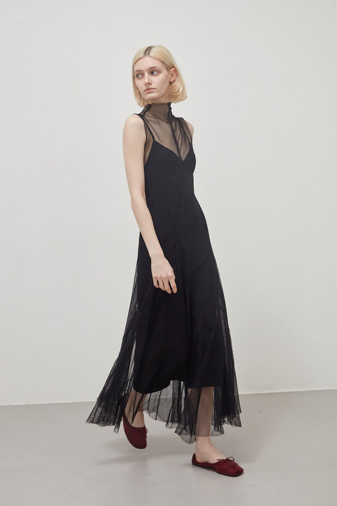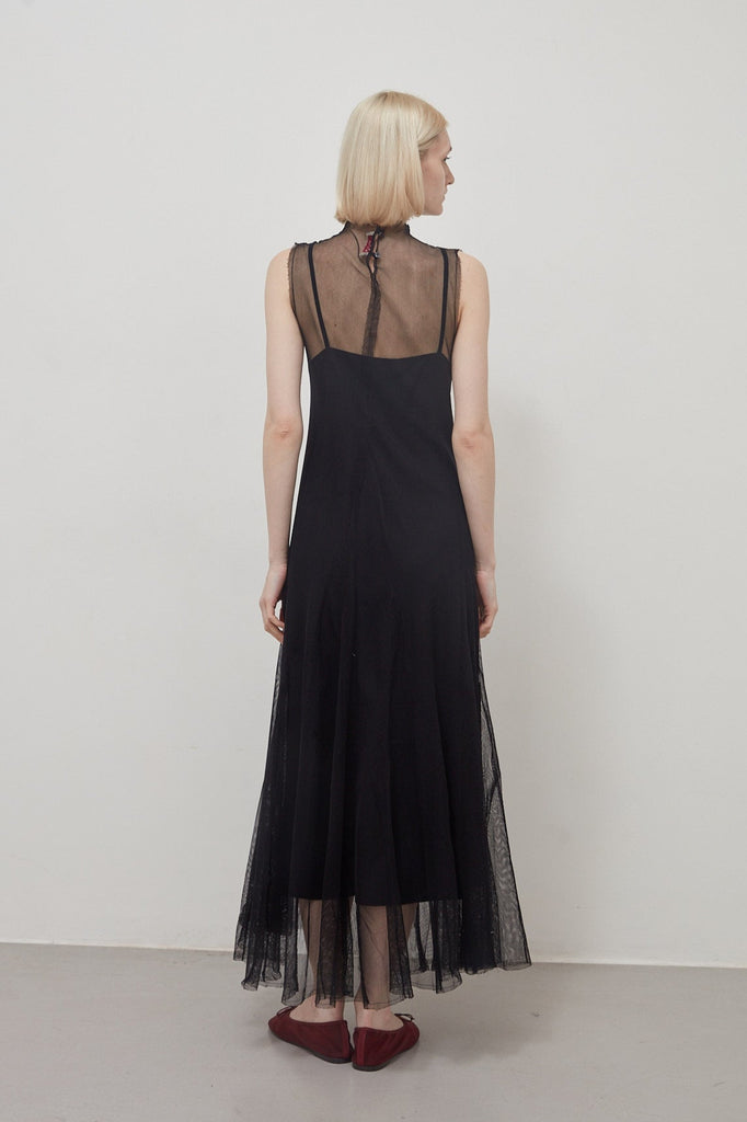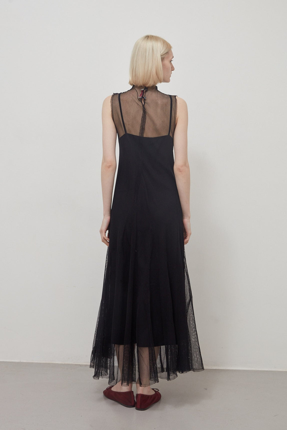 Long, fitted sleeveless dress in black cotton tulle: crater neck, double button closure at the center back, horizontal darts on the bust. Asymmetrical wedge inserts on the front and back that give volume and movement to the skirt. All edges are left raw cut. The dress also includes a matching slip with a V-neck and side slit.