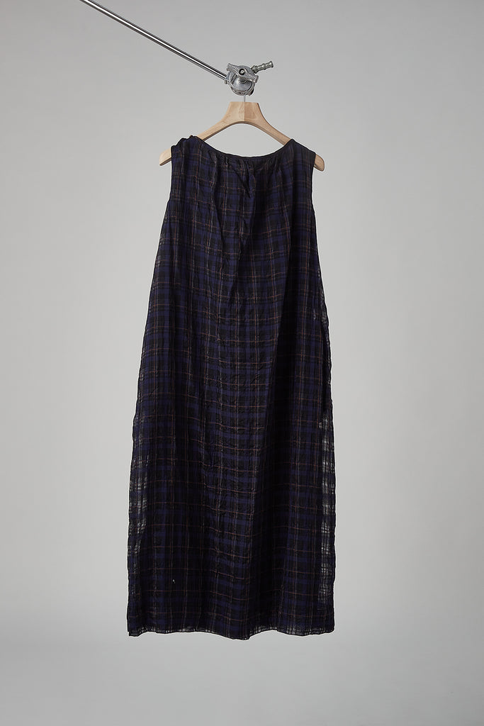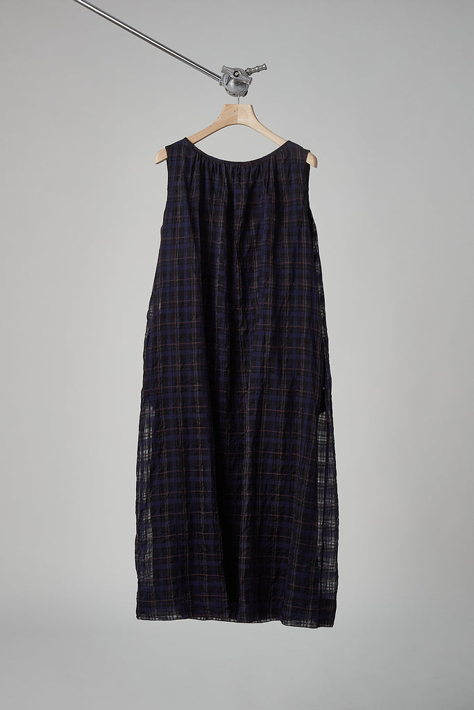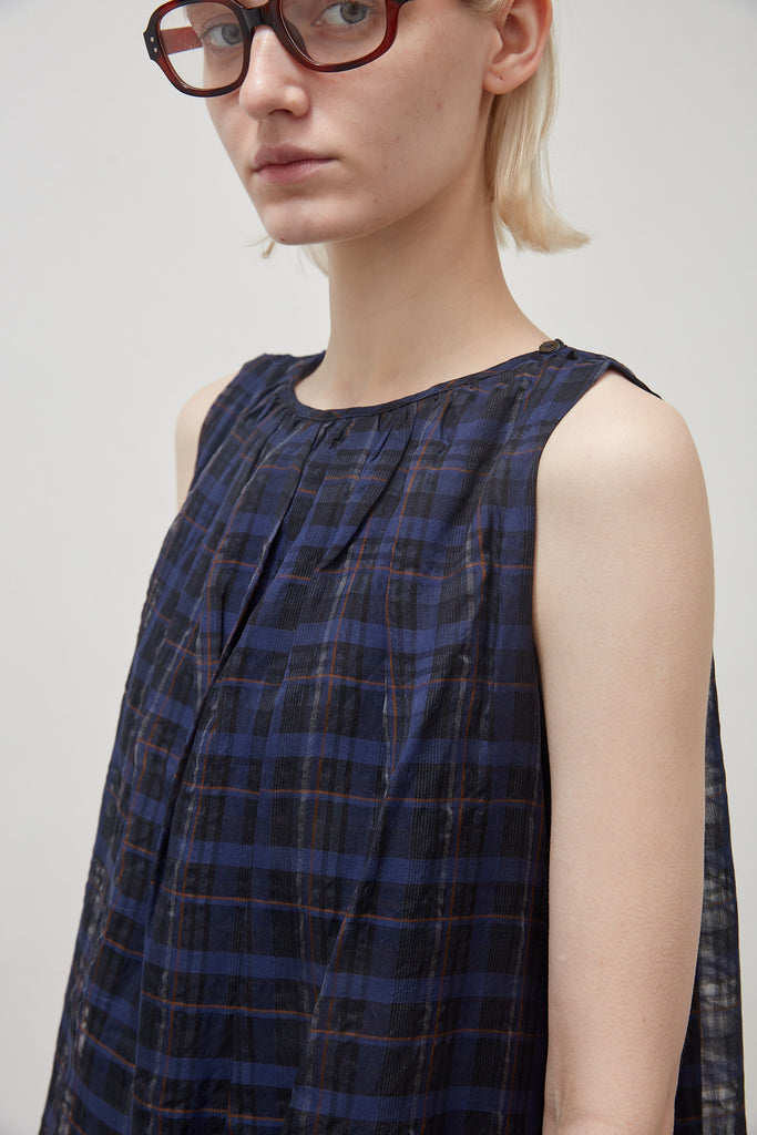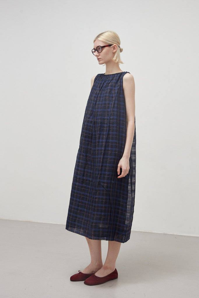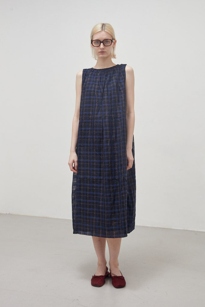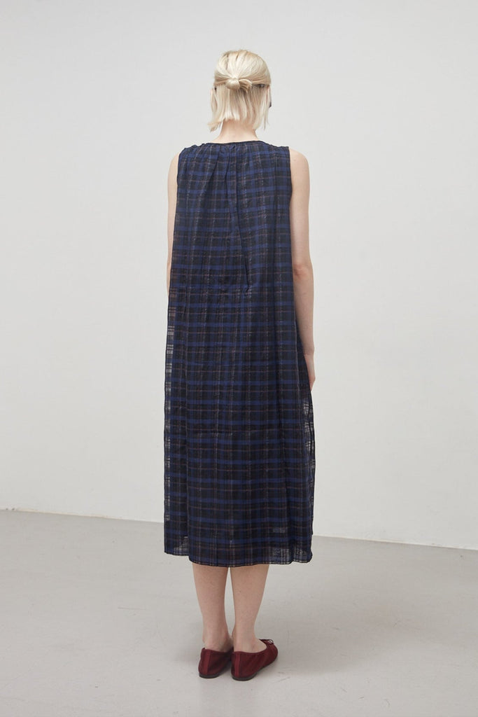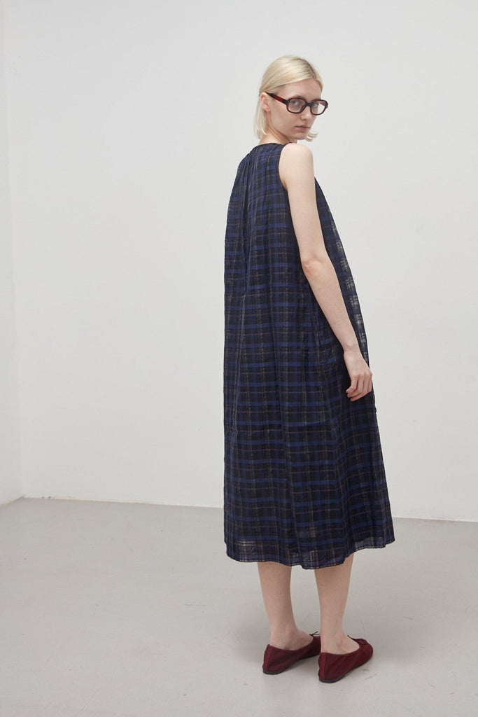 Sleeveless egg-shaped dress in blue and black checked cotton and silk organza: boat neckline finished with bias binding, gathered front and gathered center back, teardrop fastening with button on the shoulder, high hem at the bottom, cut at the center back. Lined in lightweight cotton in the same color.