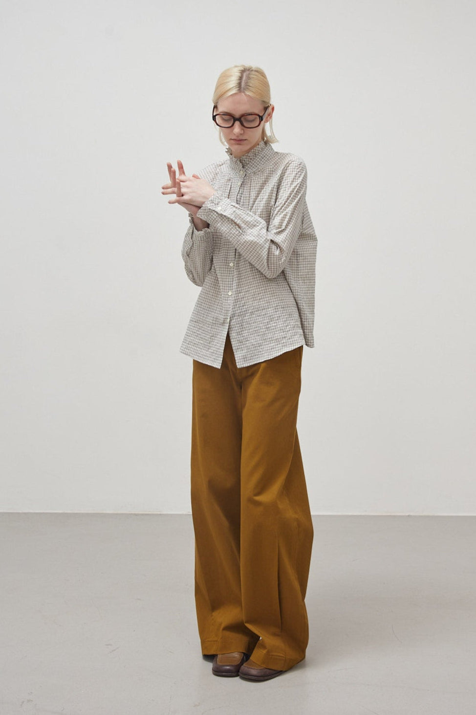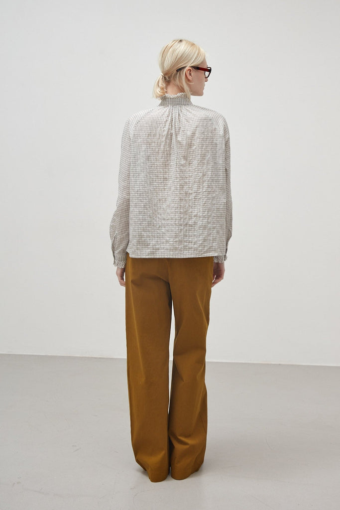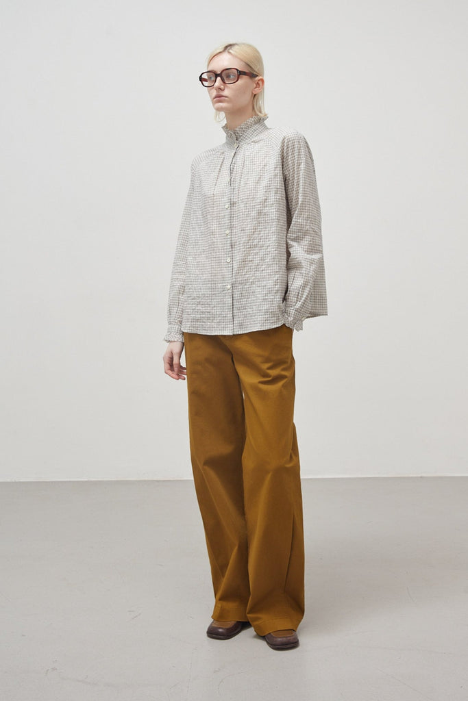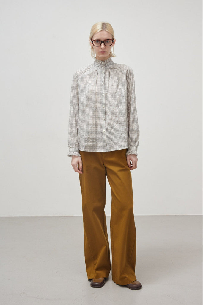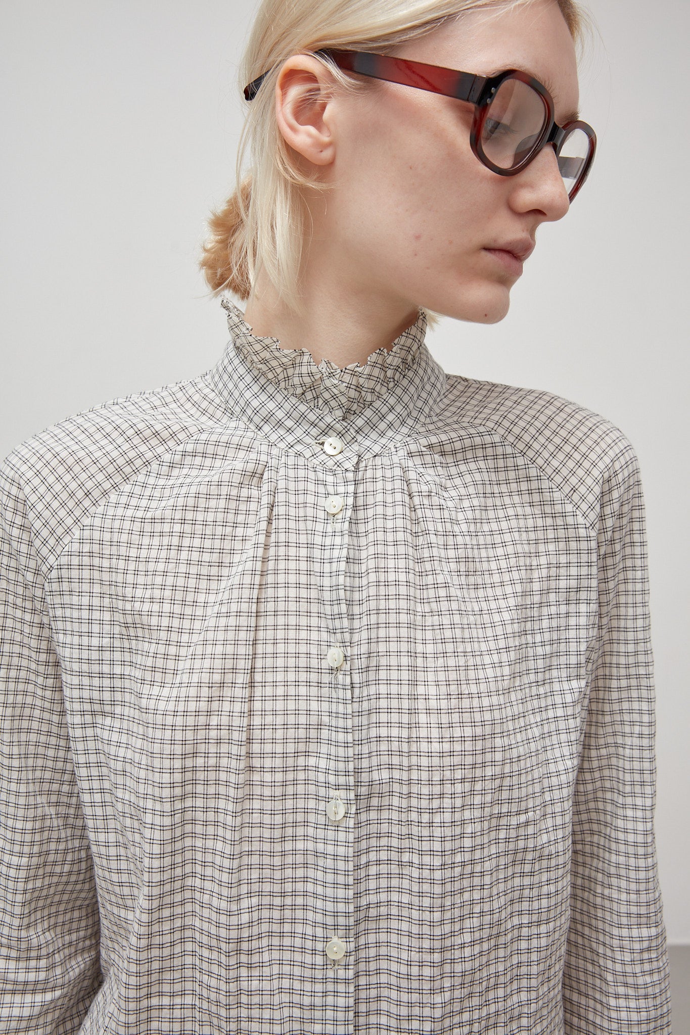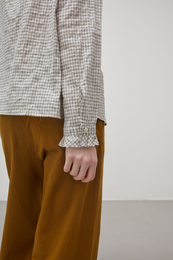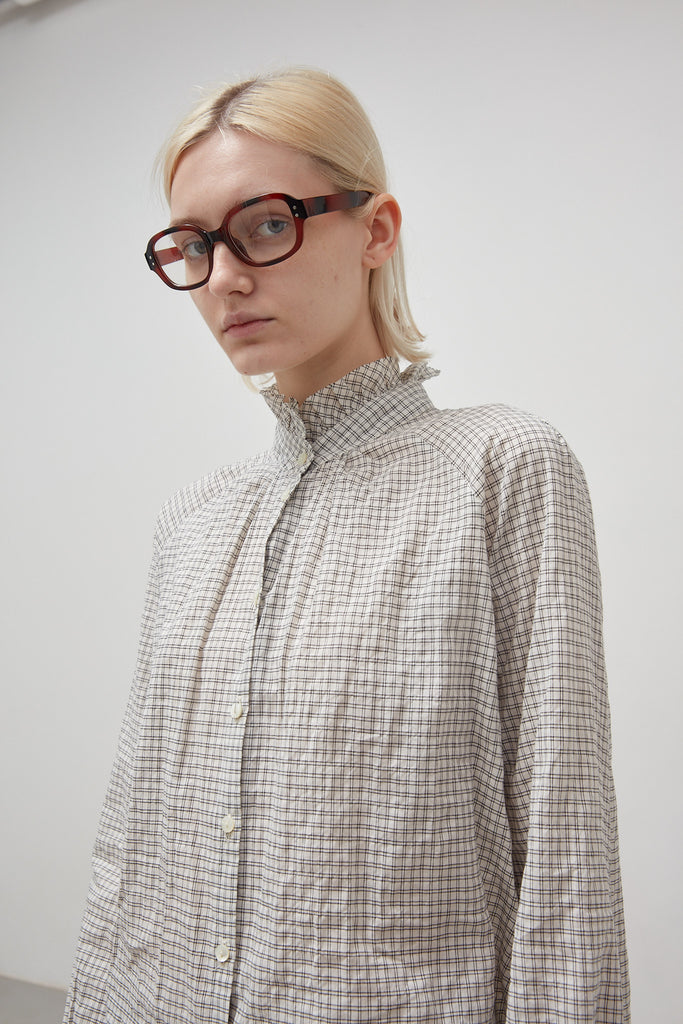 Flared shirt in lightweight Japanese cotton with black and white checks: mandarin collar with small raw-cut ruffle, raglan sleeve, pleats at the base of the collar on the front and back, central fastening with seven mother-of-pearl buttons, cuff with pleats and small raw-cut ruffle, closed with buttonhole and button.