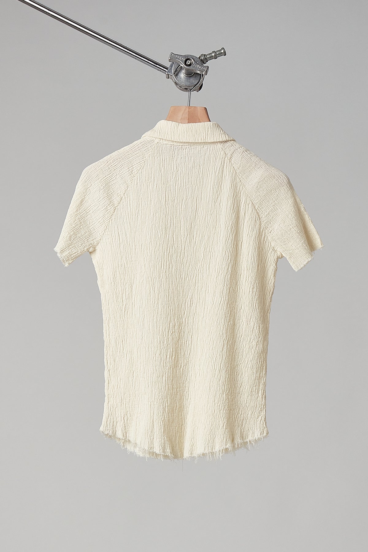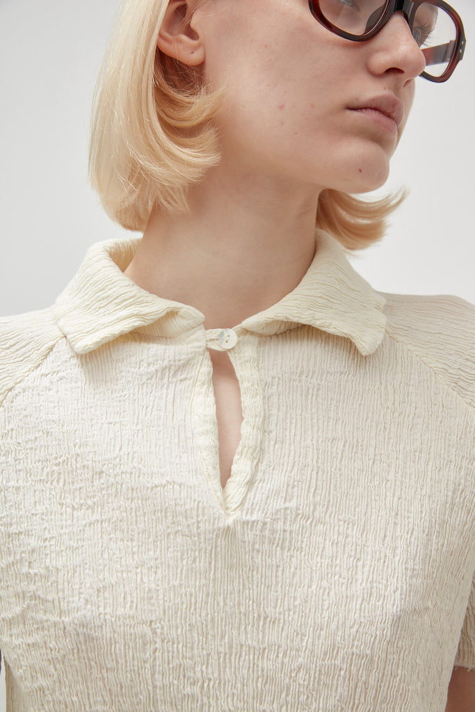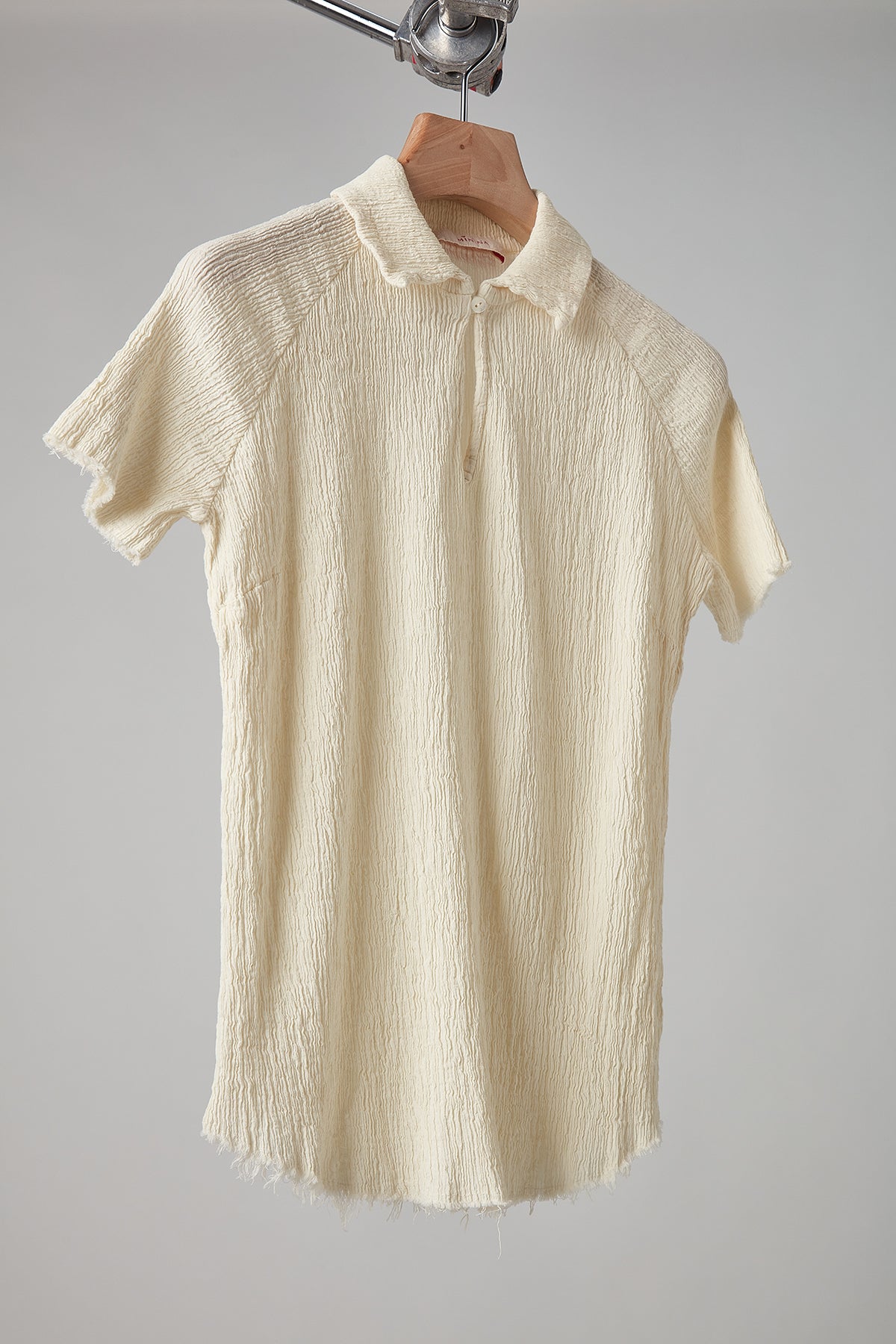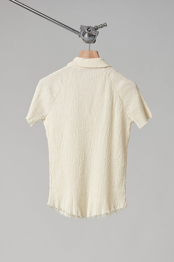 Short-sleeved shirt in embossed and stretch cotton, garment-dyed in coconut colour: raglan sleeve, small pointed collar with teardrop opening and button, finished with raw cut on the bottom and sleeves.