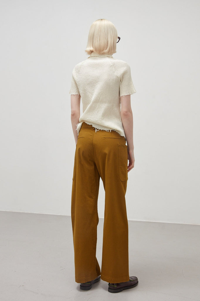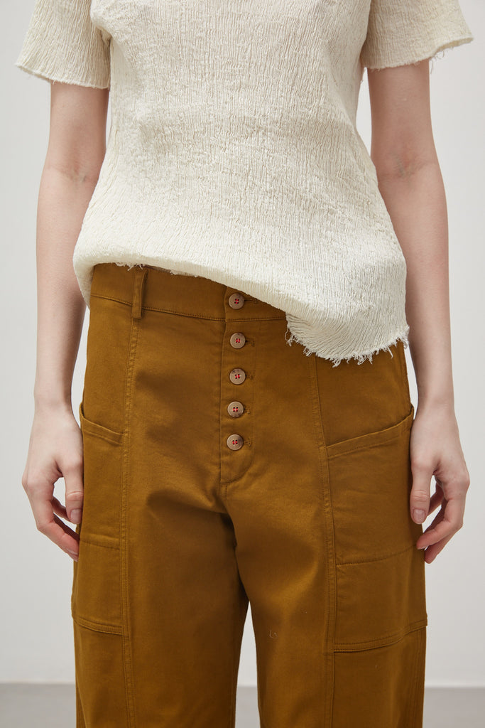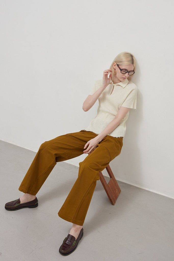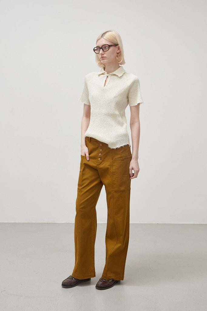 Short-sleeved shirt in embossed and stretch cotton, garment-dyed in coconut colour: raglan sleeve, small pointed collar with teardrop opening and button, finished with raw cut on the bottom and sleeves.
