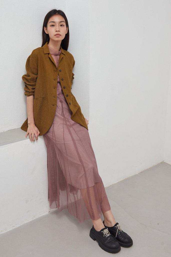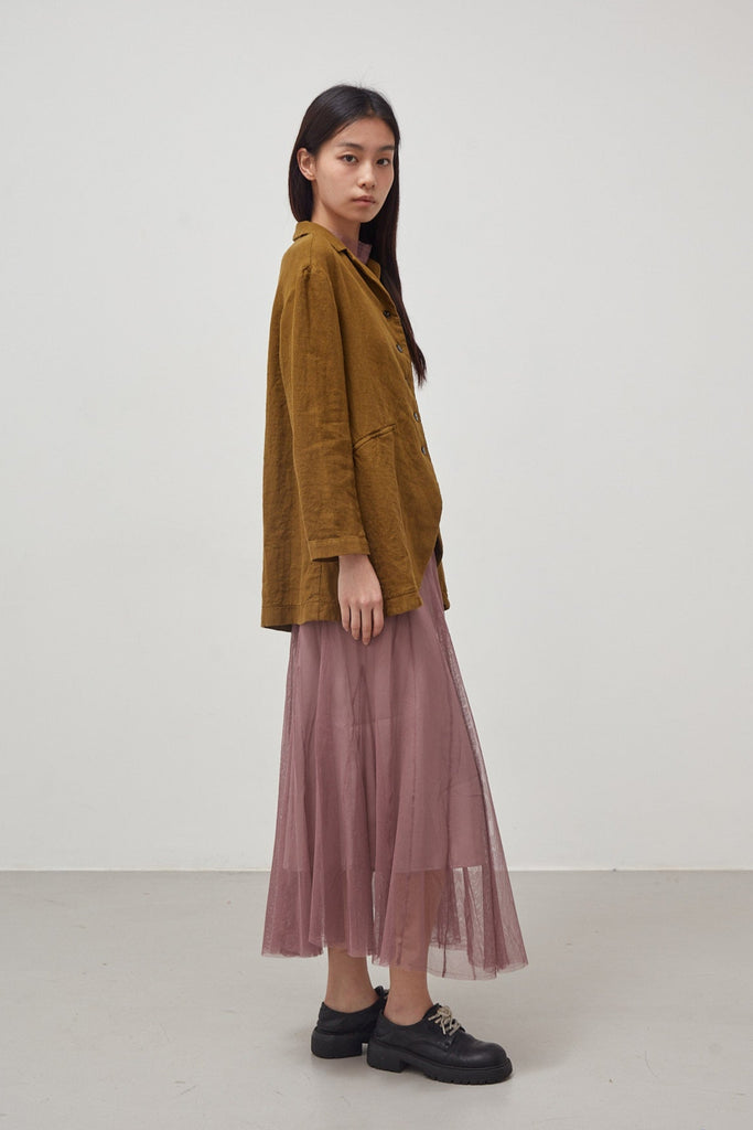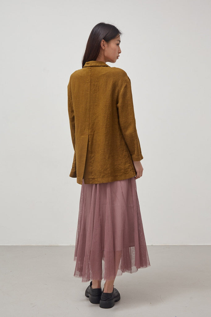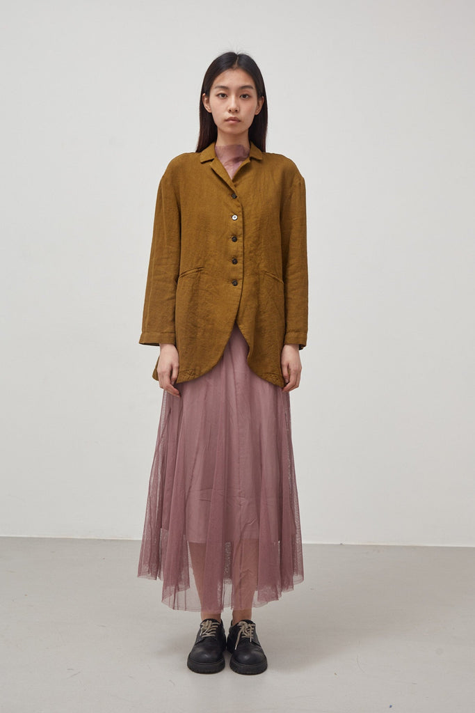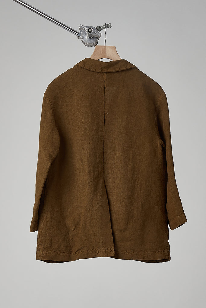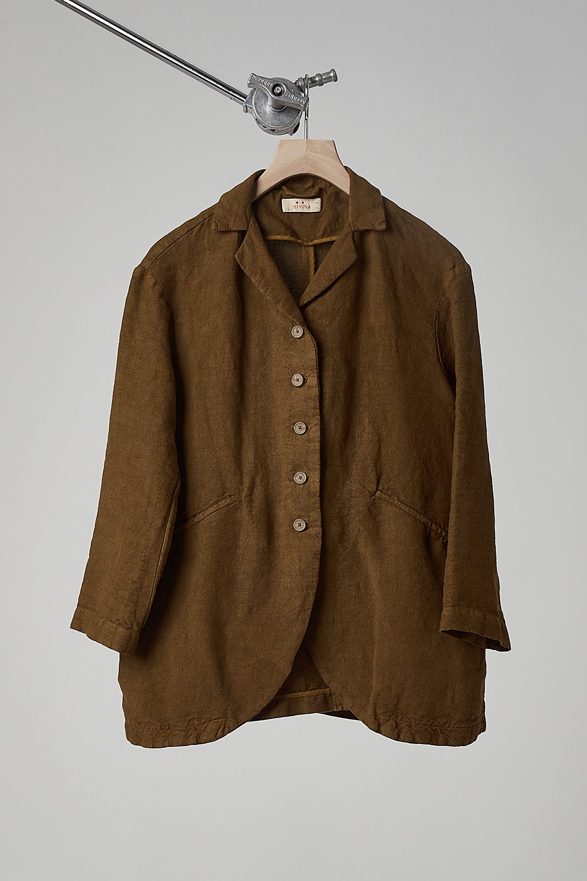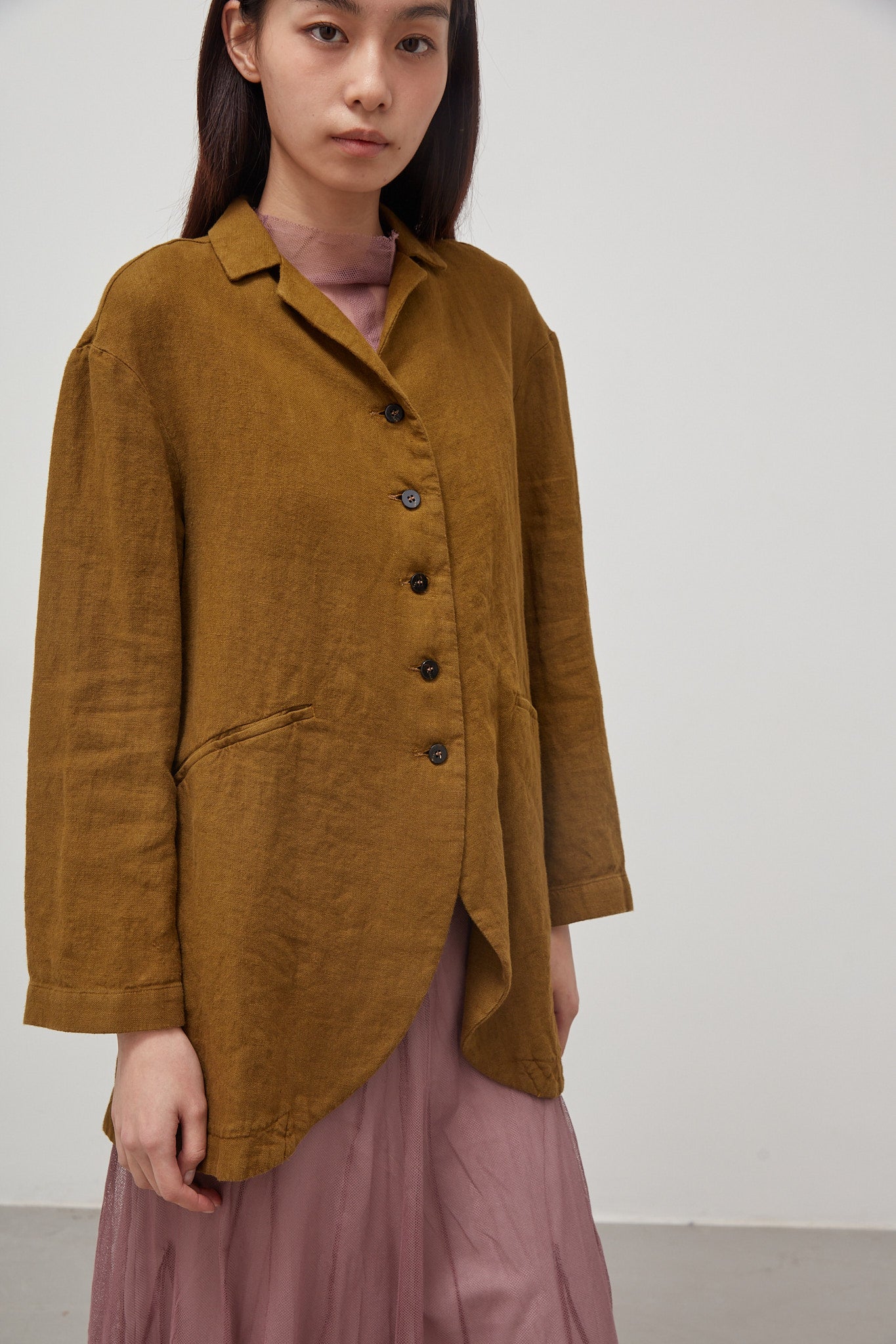 Peacoat jacket in raw linen garment-dyed in oil color: flared cut, dropped shoulder, small lapel collar, central fastening with 5 buttons, diagonal welt pockets, shorter and rounded front hem, central slit on the back. Unlined and finished internally with bias binding in the same color.
