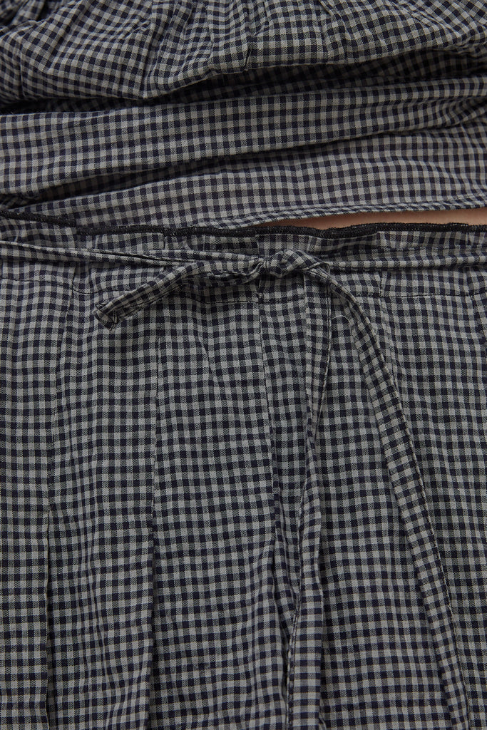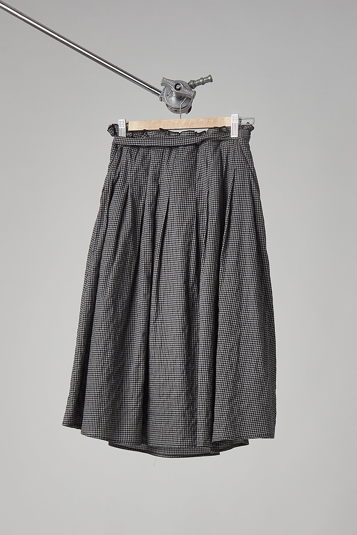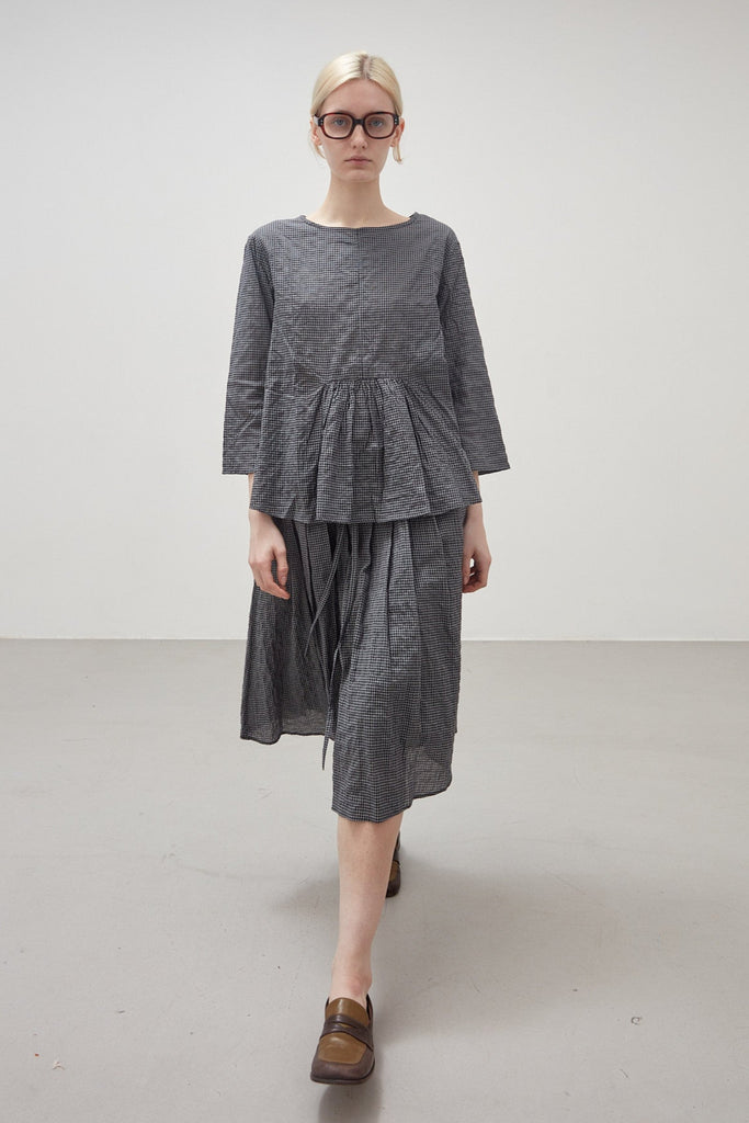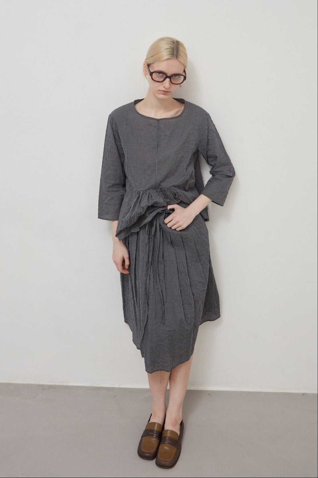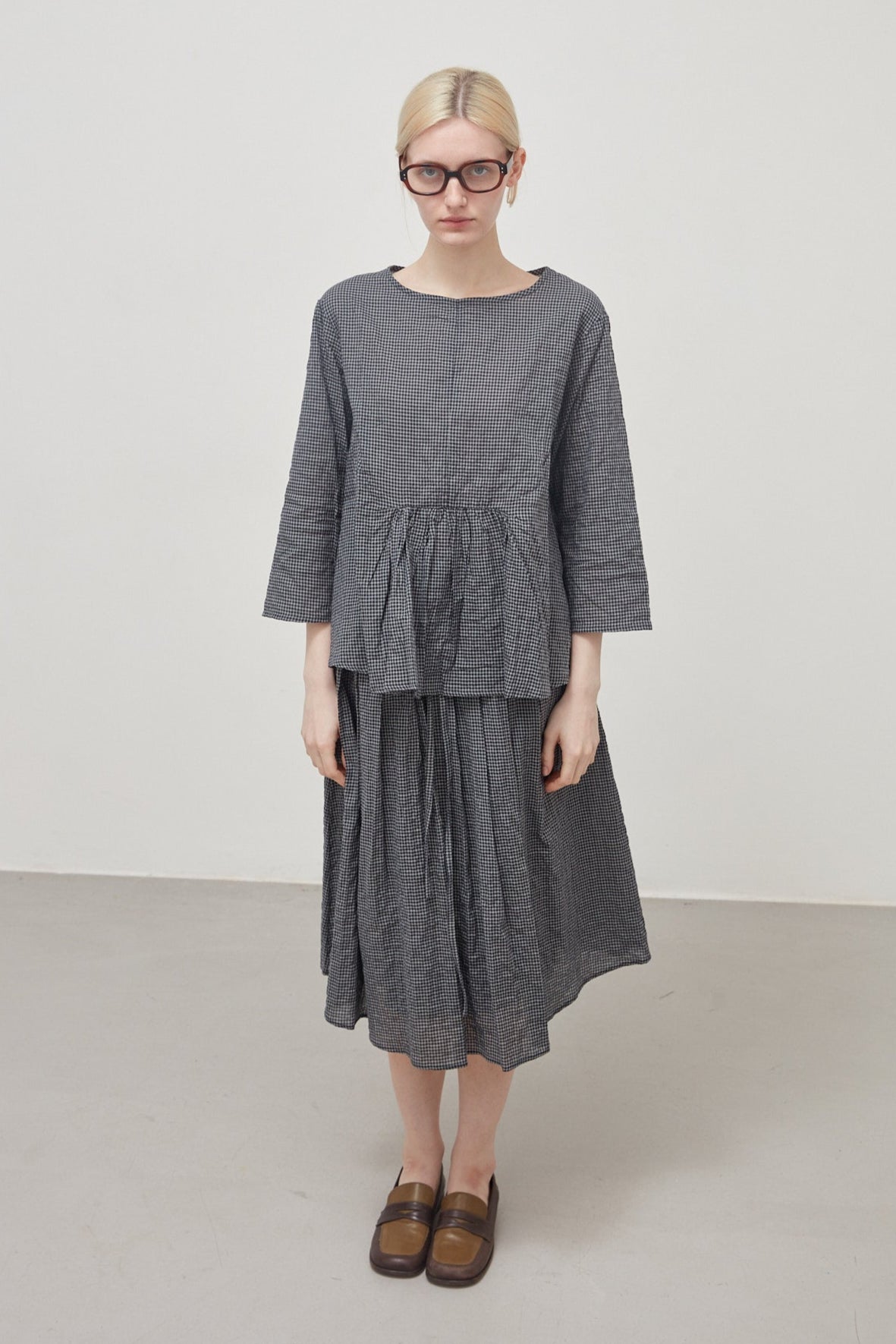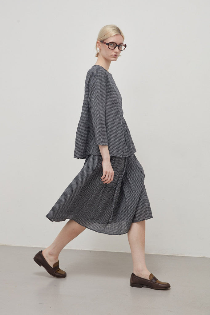 Midi skirt in lightweight Japanese cotton with grey and blue checks: flared cut, peplum with closed pleats that continue on the body of the skirt, invisible zip fastening on the side in the same colour, decorative ribbon at the waist. Inside waistline finished with a cotton grosgrain ribbon. Lining in lightweight cotton in the same colour.