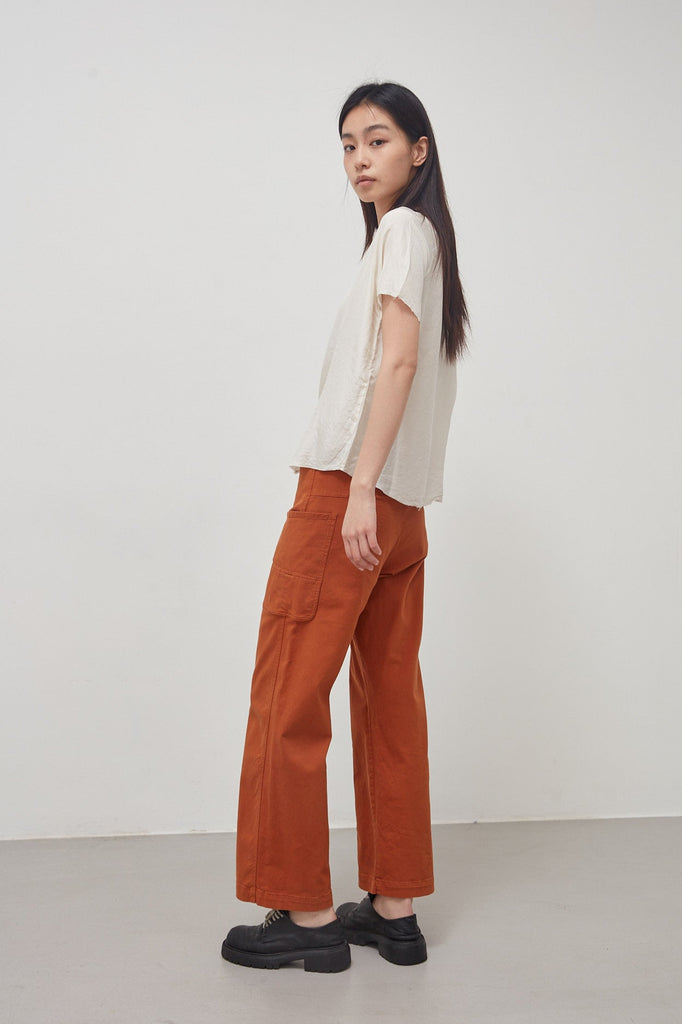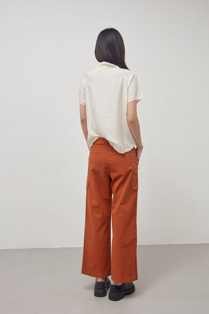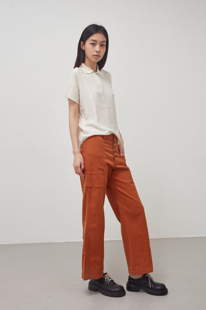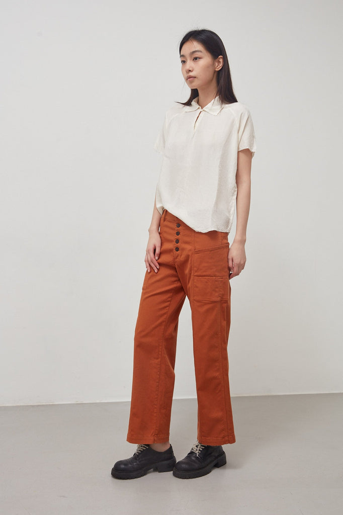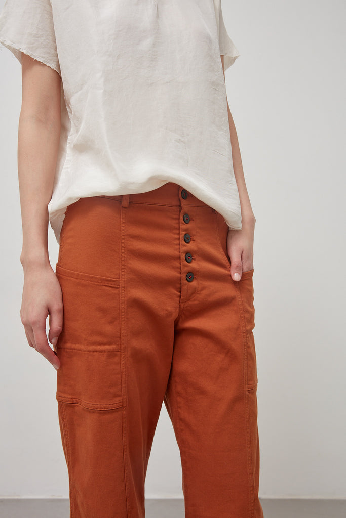 Stretch cotton drill cargo trousers, garment dyed in turmeric: straight wide leg, waistband with belt loops and front fastening with five visible buttons sewn with contrasting dark red thread, large side pockets applied on the outside of the thigh. The seams are all double stitched in jeans style.