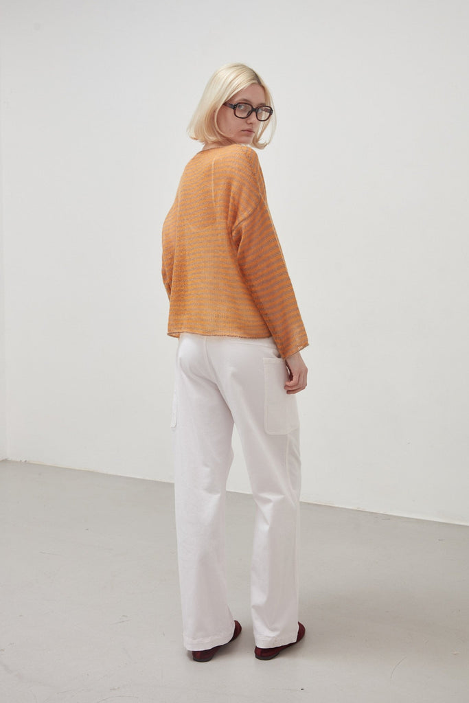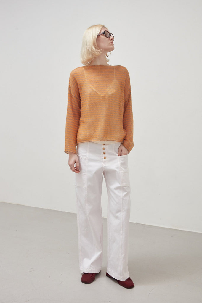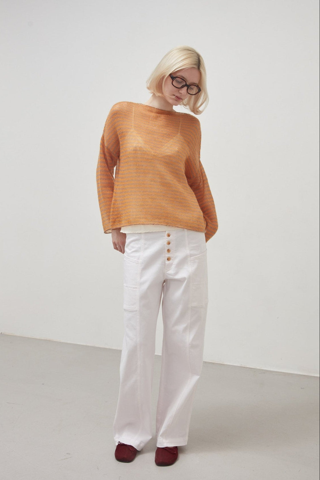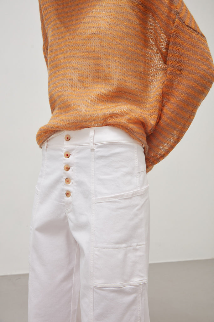 Stretch cotton drill cargo trousers, garment dyed in quartz pink: straight wide leg, belt with belt loops and front fastening with five visible buttons sewn with contrasting dark red thread, large side pockets applied on the outside of the thigh. The seams are all double stitched in jeans style.