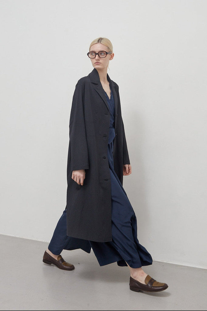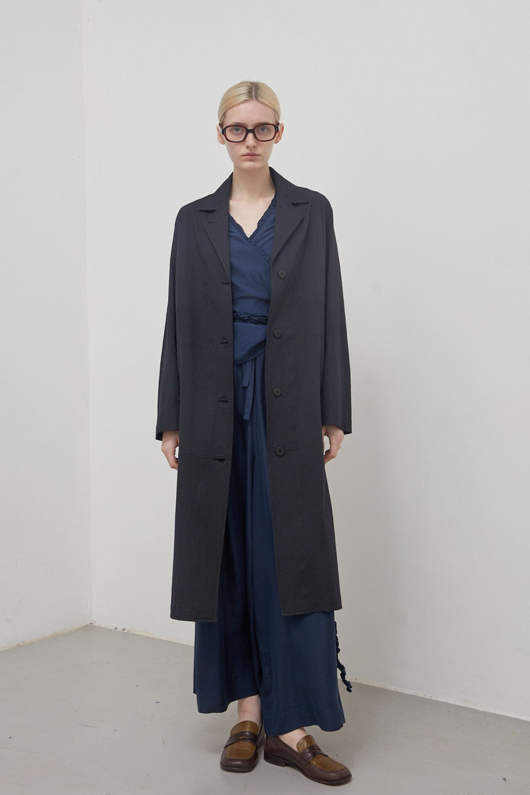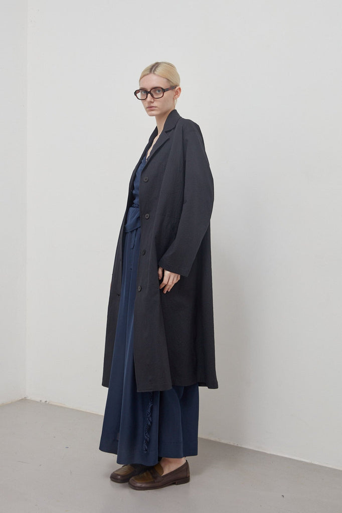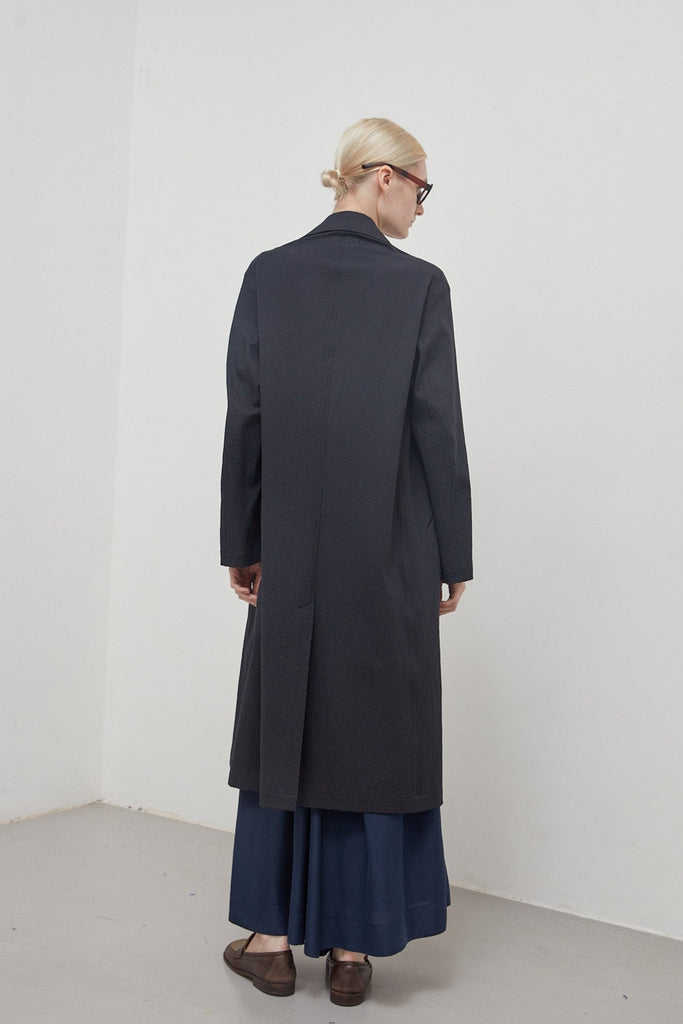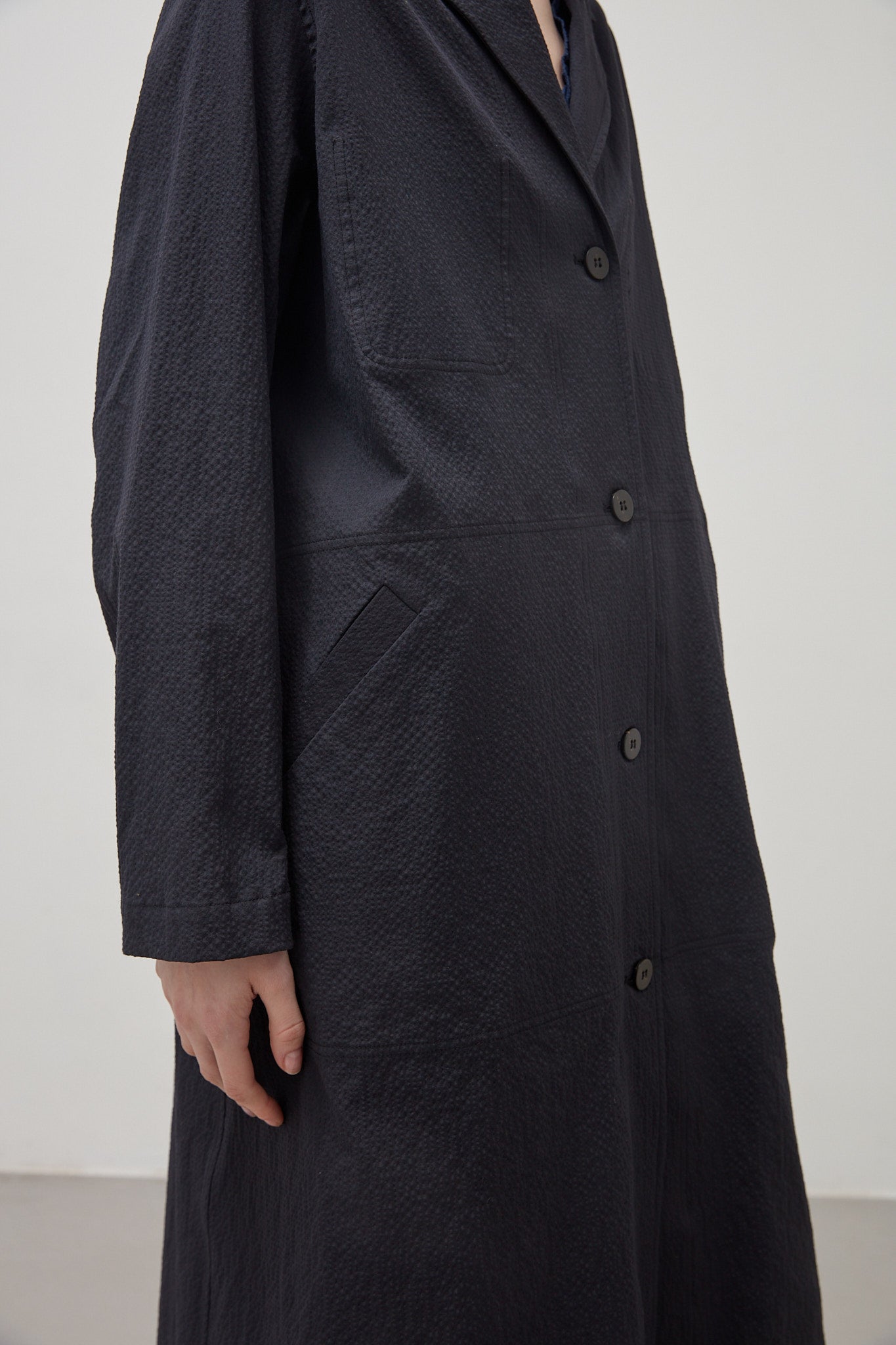 Long oversized duster coat in midnight blue stretch cotton seersucker: dropped shoulder, small pointed collar, slanted welt pockets and high internal pocket, five buttons center front closure. Oblique point of the placket with first button under the point of the collar, double horizontal cut, central slit on the back. All seams are topstitched. Unlined.