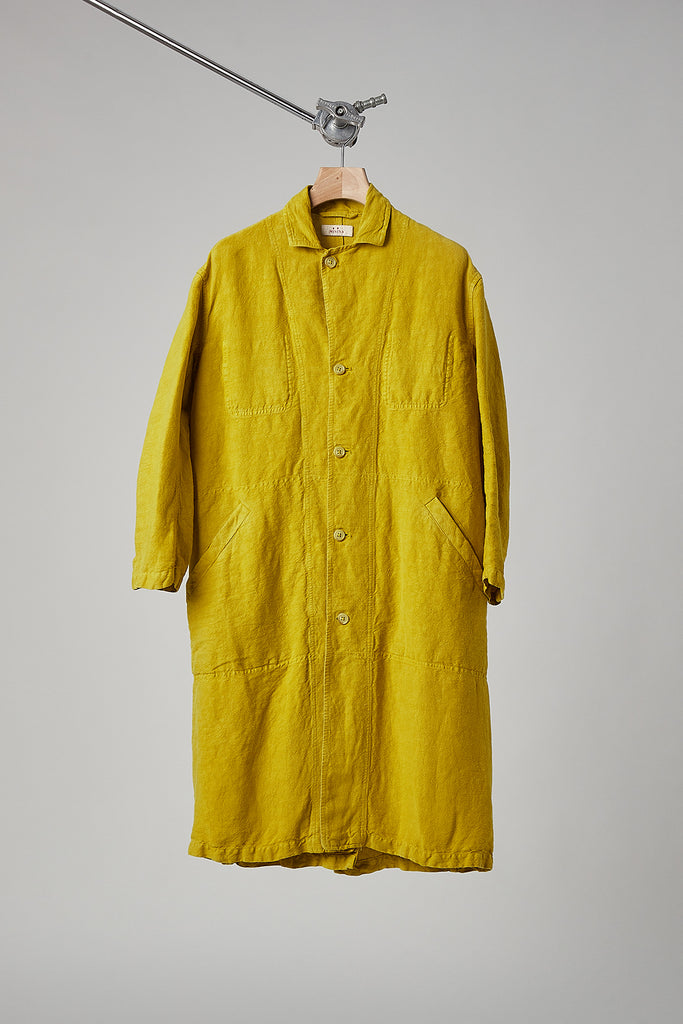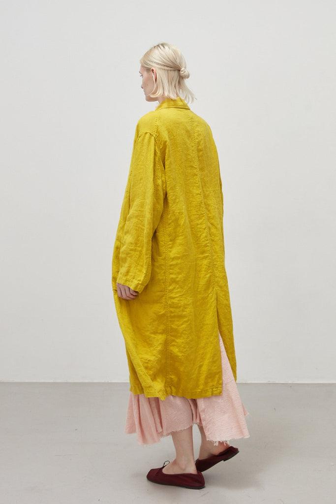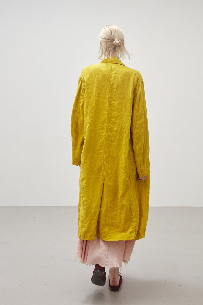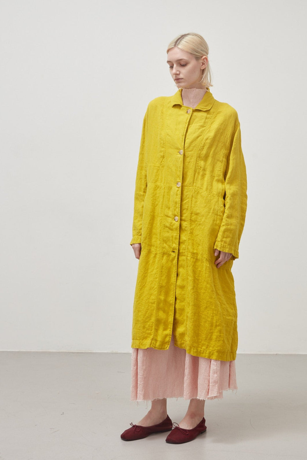 Long oversized duster coat in lime-colored garment-dyed raw linen: dropped shoulder, small pointed collar, oblique welt pockets and high internal pocket, five buttons center front closure. Oblique point of the placket with first button under the point of the collar, double horizontal cut, central slit on the back. All seams are topstitched. Unlined.