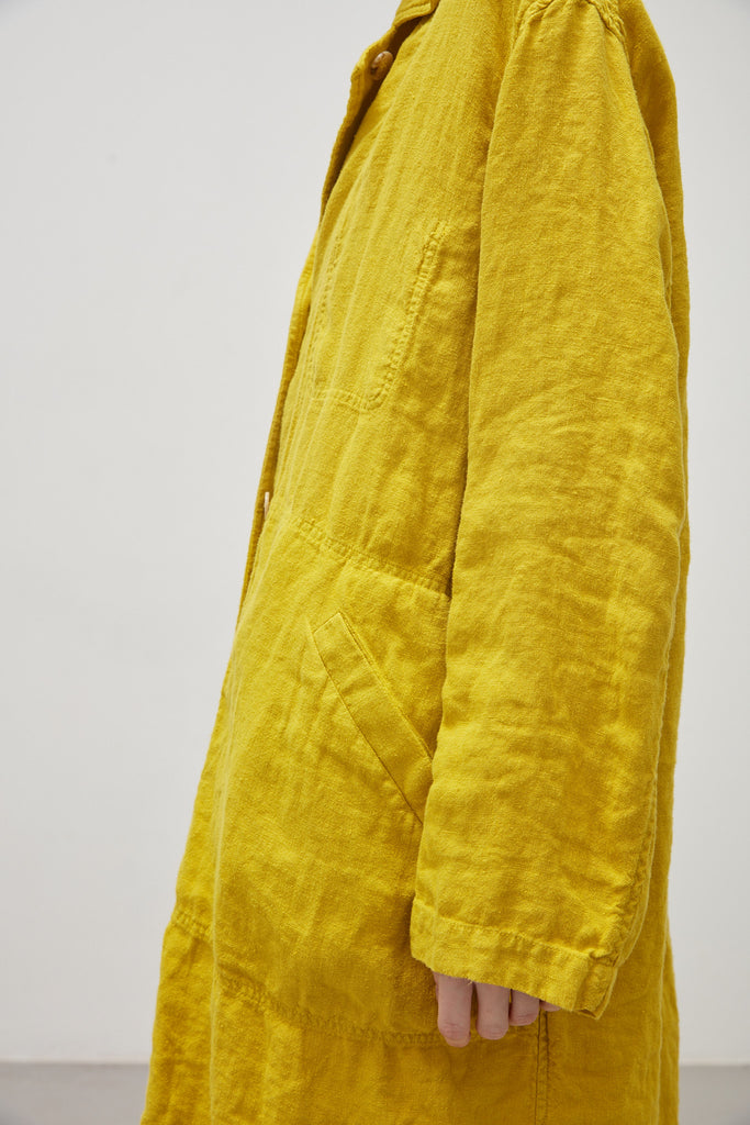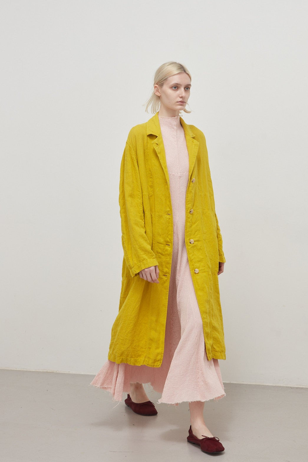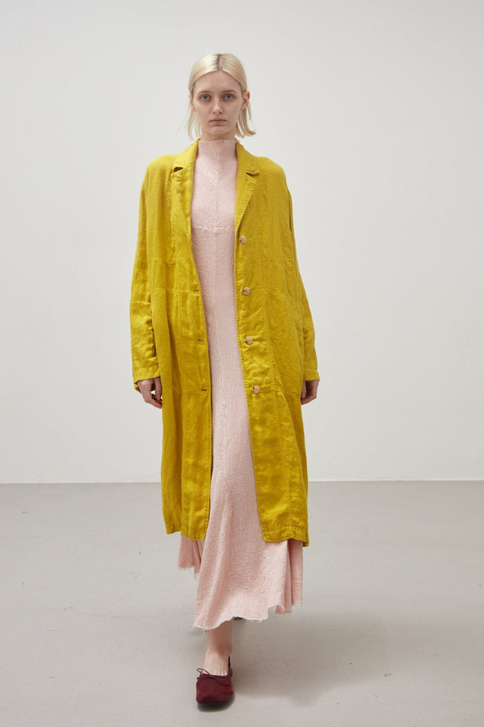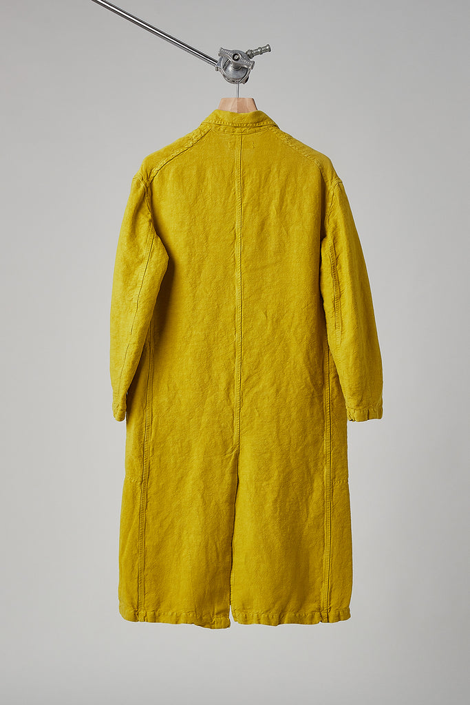 Long oversized duster coat in lime-colored garment-dyed raw linen: dropped shoulder, small pointed collar, oblique welt pockets and high internal pocket, five buttons center front closure. Oblique point of the placket with first button under the point of the collar, double horizontal cut, central slit on the back. All seams are topstitched. Unlined.