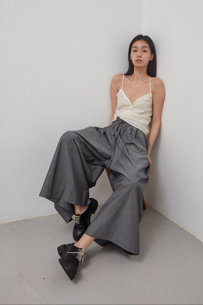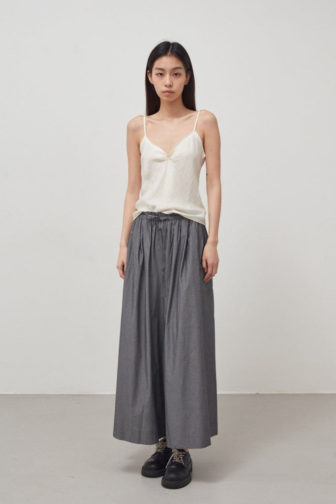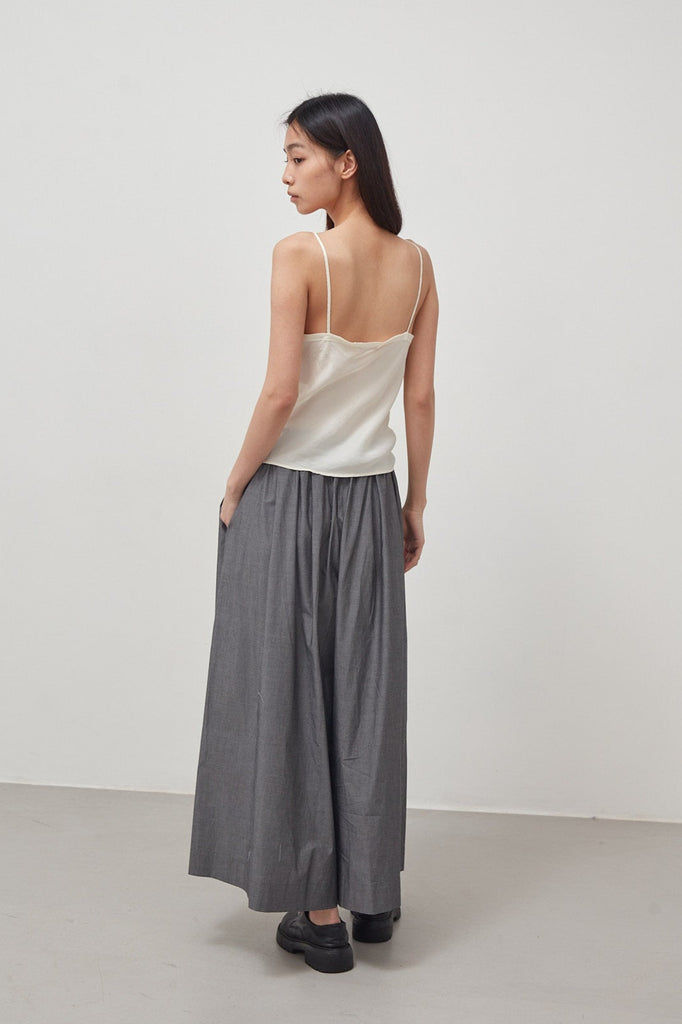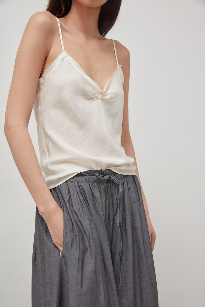 Biscuit-colored garment-dyed habotai silk top: bias cut, V-neckline at the front with double raw-cut edge and small decorative pleats in the center, thin shoulder straps that can be shortened, small hem at the bottom.
