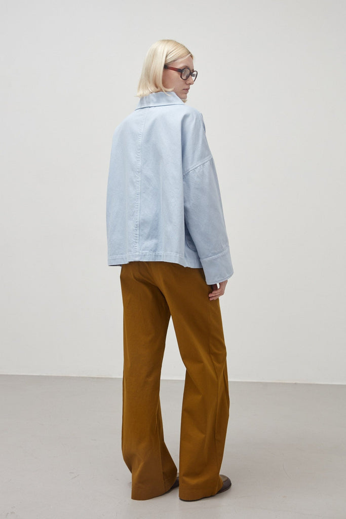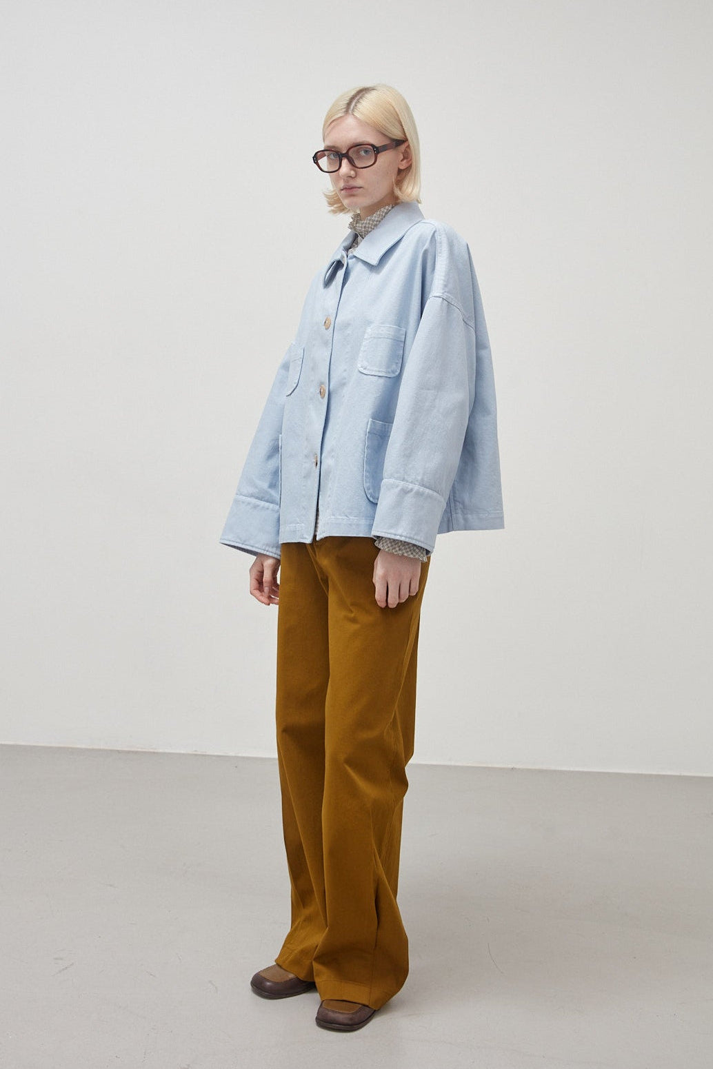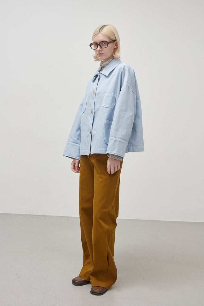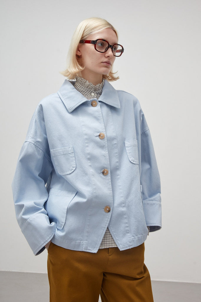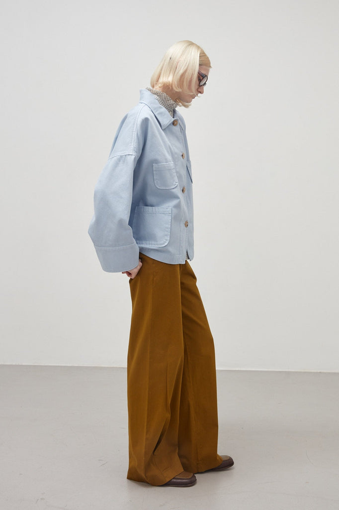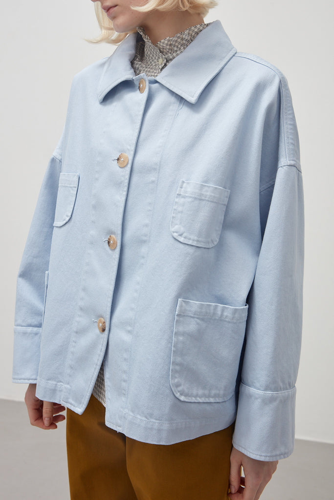 Oversized boxy cut jacket in dry cotton drill, garment dyed in wisteria: dropped shoulders, wide sleeves with high hem at the bottom, small collar, four patch pockets, central fastening with four buttons. Unlined and finished internally with cotton bias.