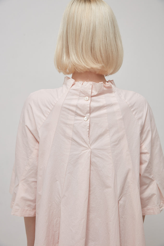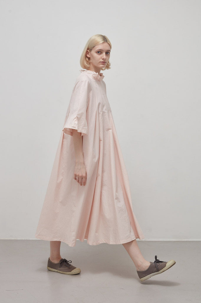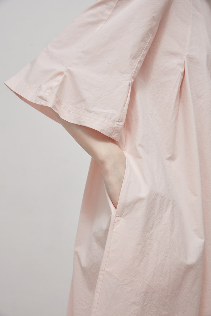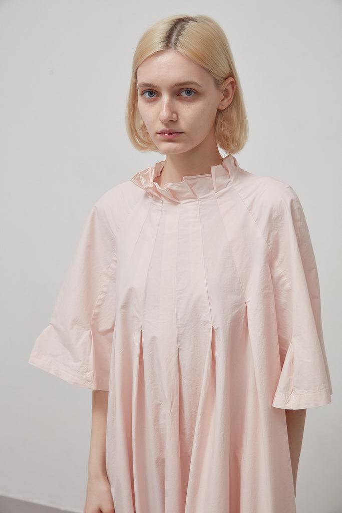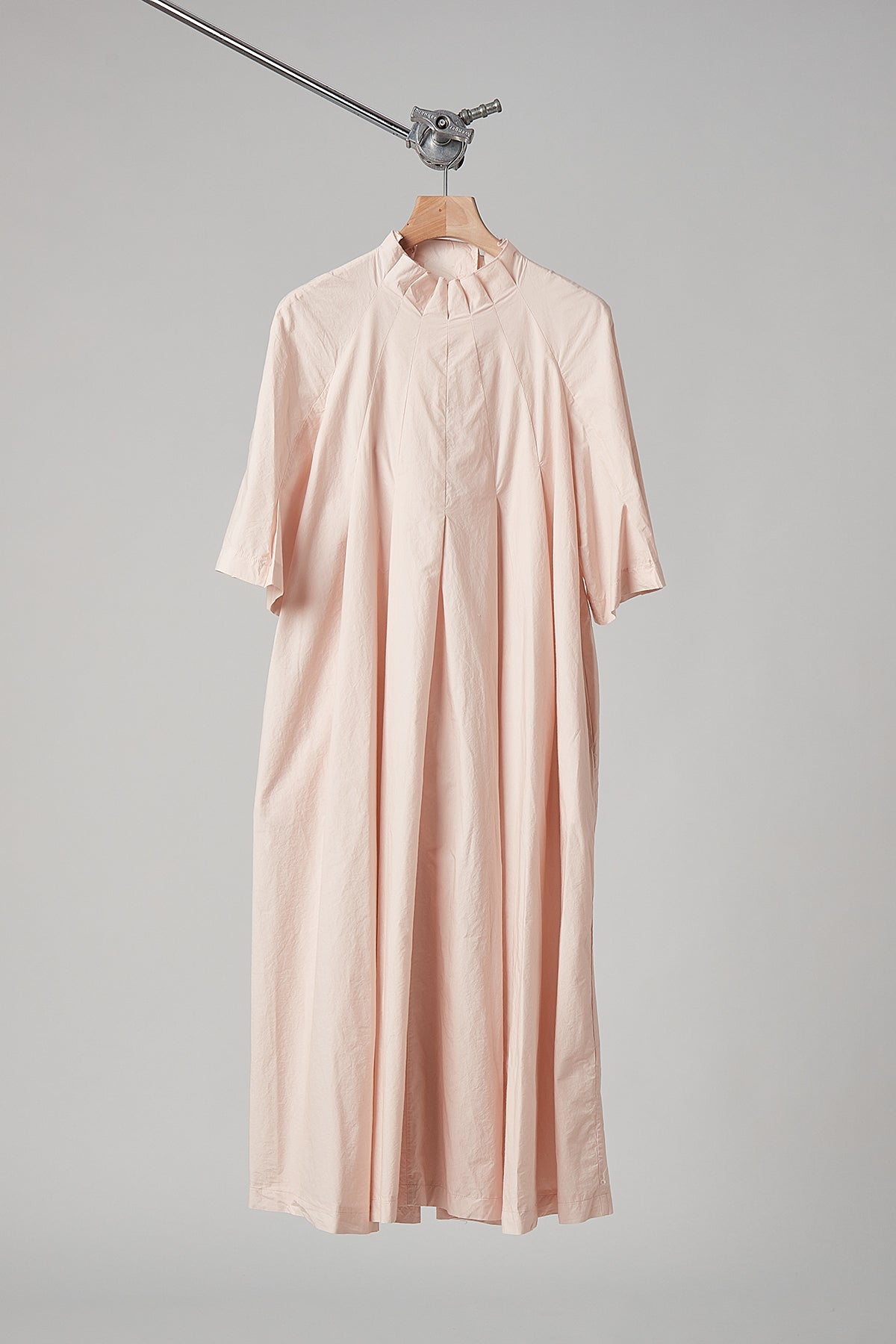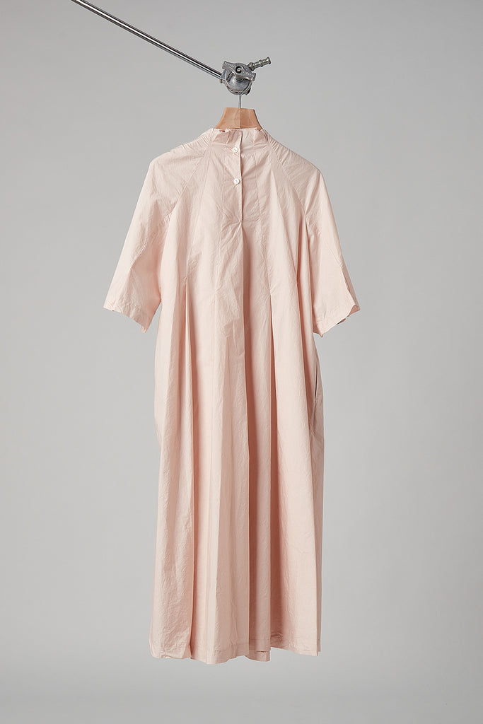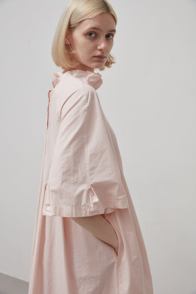 Long, flared dress in crisp cotton poplin, garment-dyed in sepia pink, unlined: high neck with pleats that continue on the bodice, sleeves and along the entire length, flared raglan sleeves to just below the elbow, side pockets, teardrop fastening at the centre back with two small buttons. High hem at the bottom and sleeves.