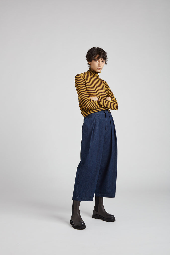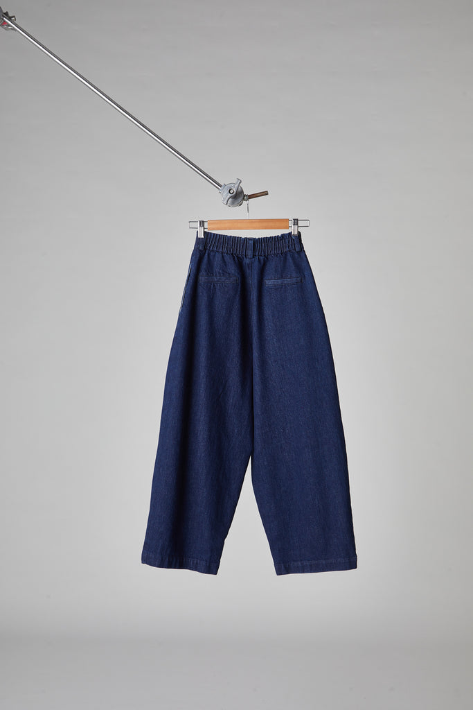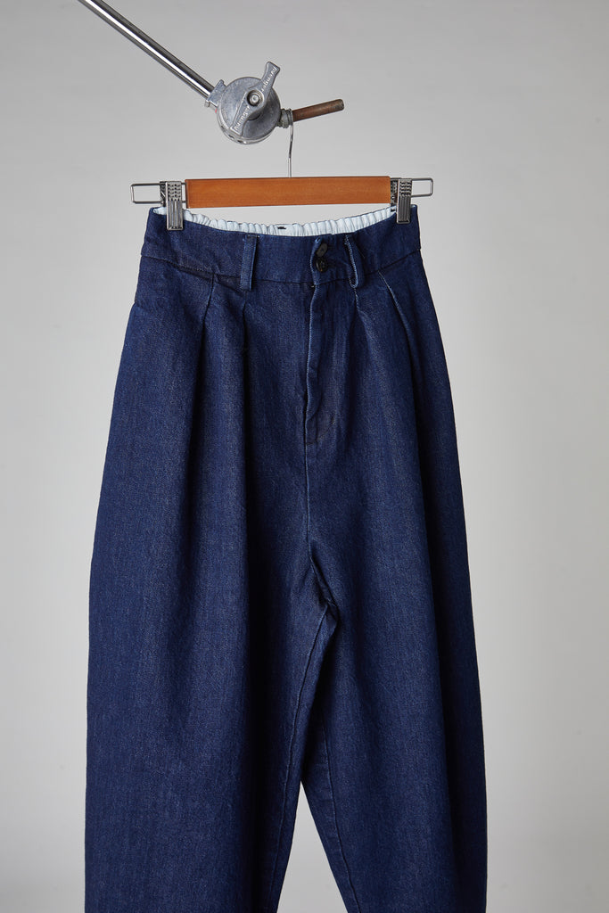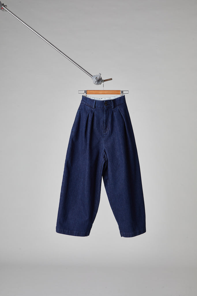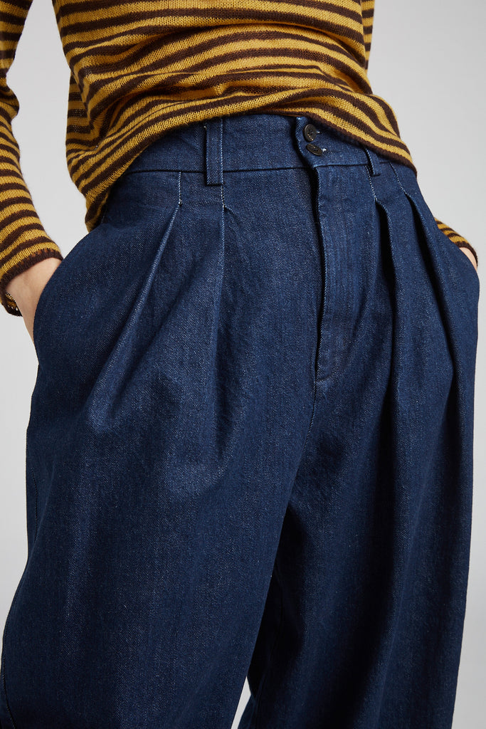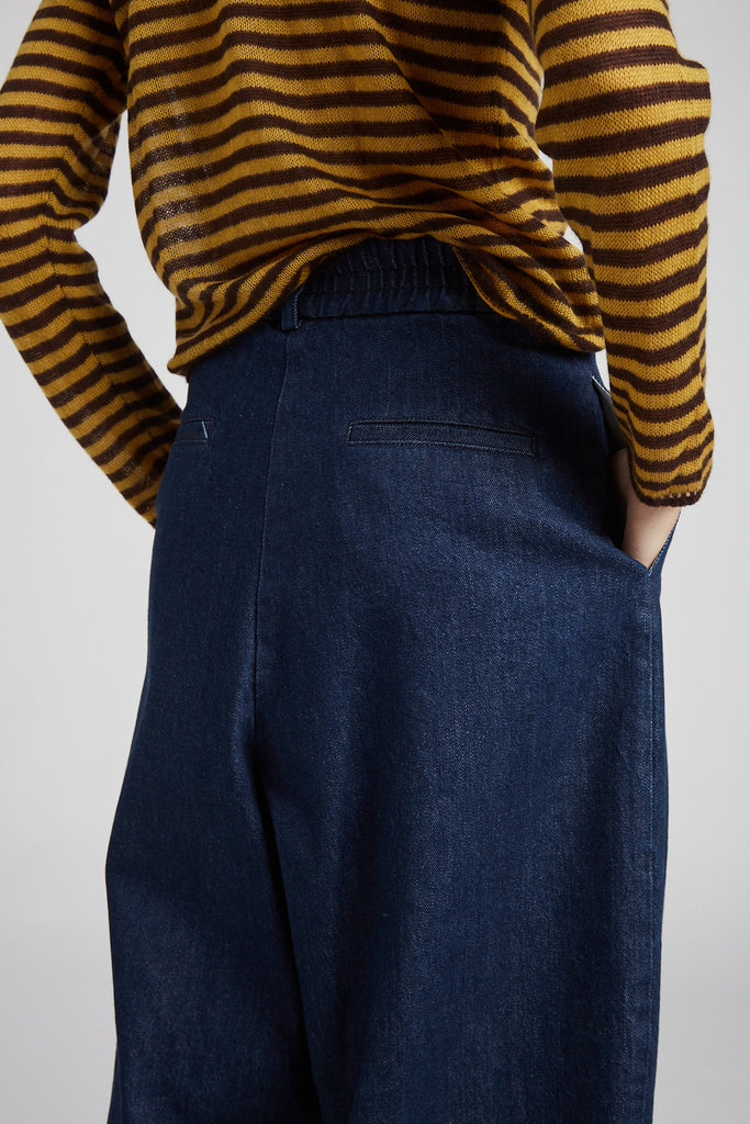 High-waisted, egg-shaped trousers in washed cotton denim: double pleats on the front, waistband with belt loops and elastic on the back, front zip fastening and double button on the waistband, front pockets on the side, back welt pockets, small hem at the bottom.