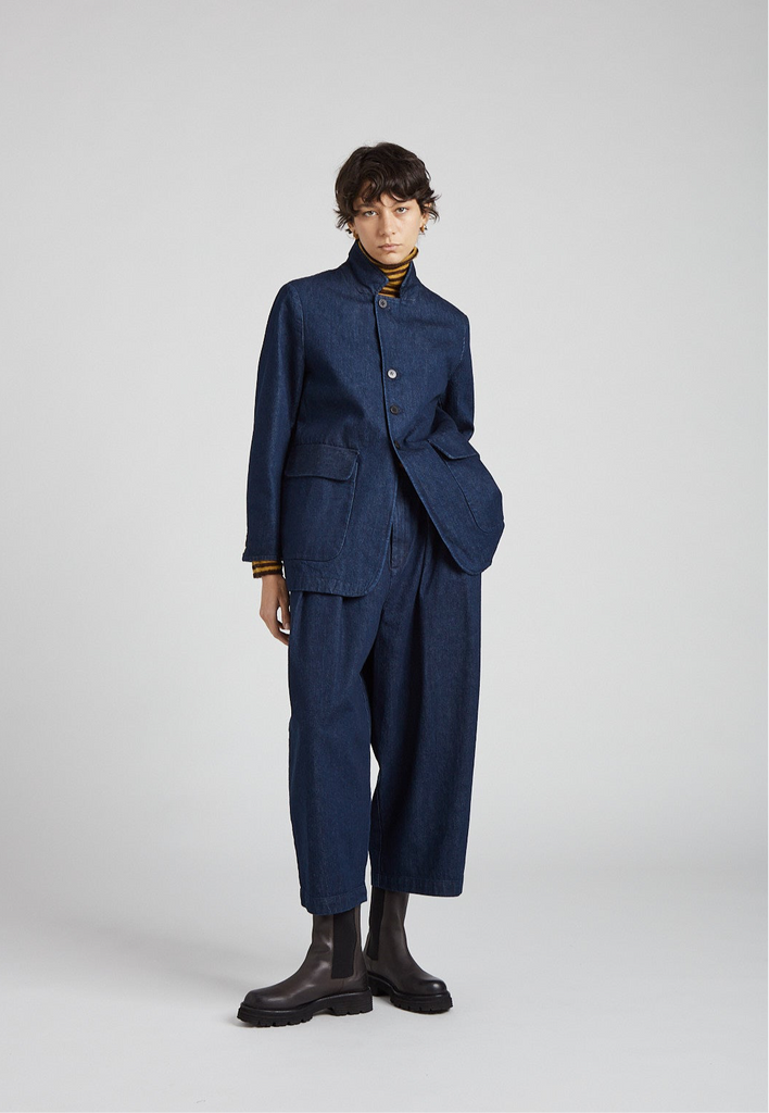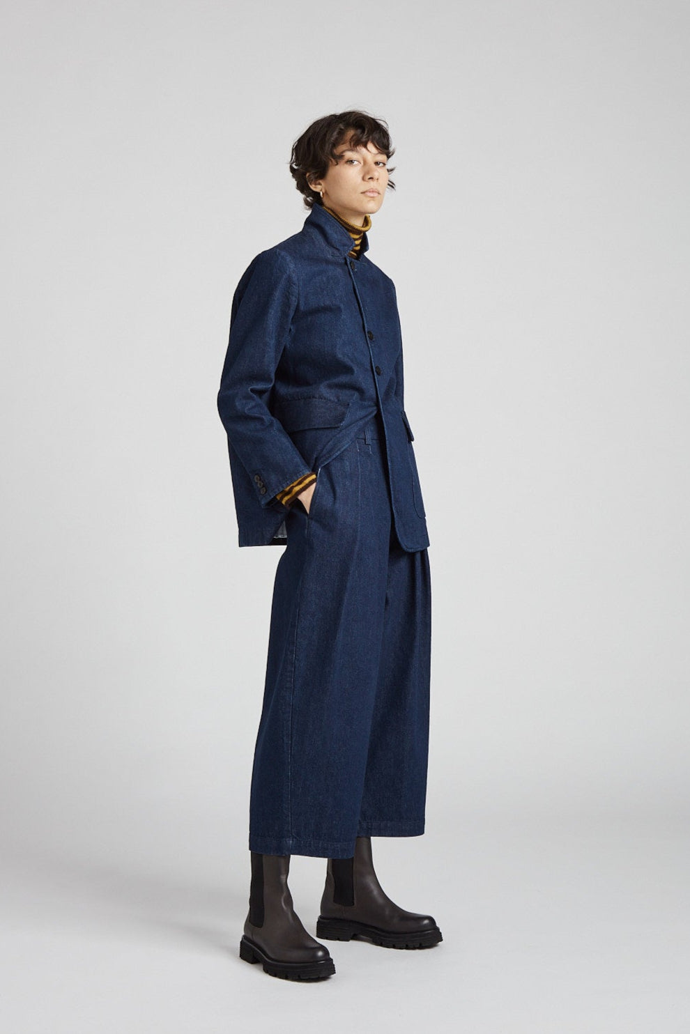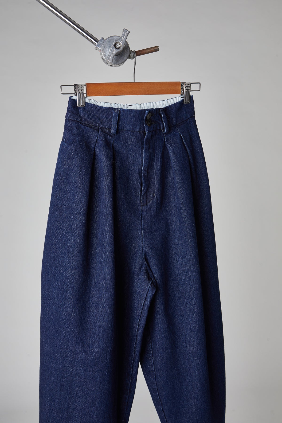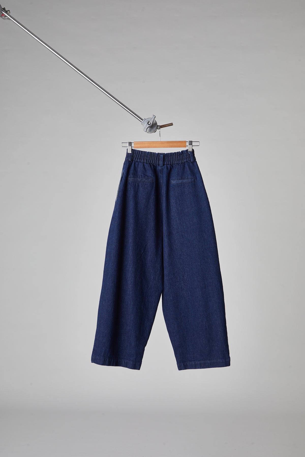 High-waisted, egg-shaped trousers in washed cotton denim: double pleats on the front, waistband with belt loops and elastic on the back, front zip fastening and double button on the waistband, front pockets on the side, back welt pockets, small hem at the bottom.