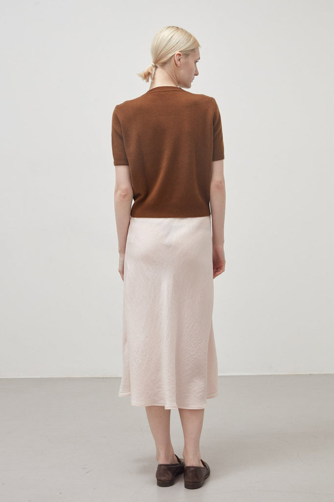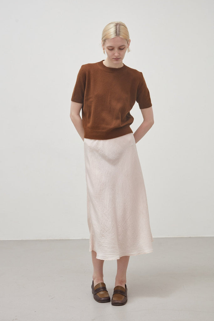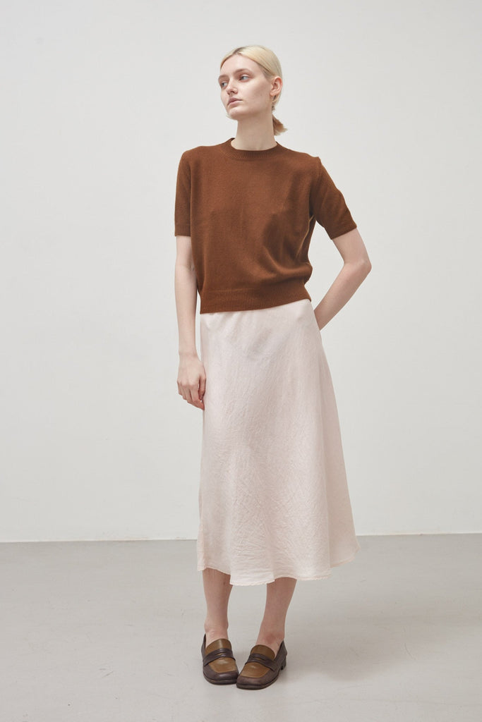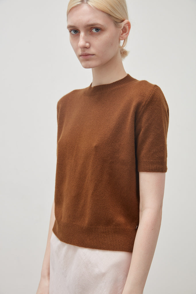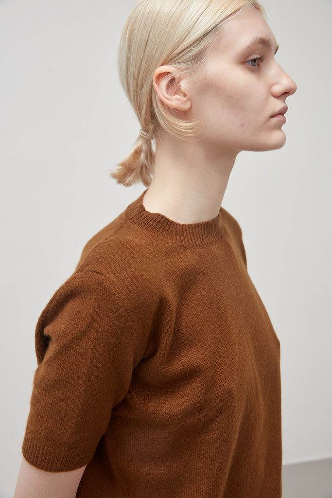 Chestnut brown cashmere crew neck sweater with short sleeves: plain weave on the body and ribbed weave on the neck, bottom and sleeves. Straight and short cut. All our sweaters have two small hand-embroidered crystals on the right side as a distinctive feature.