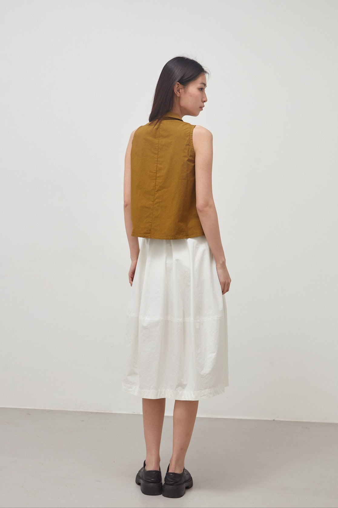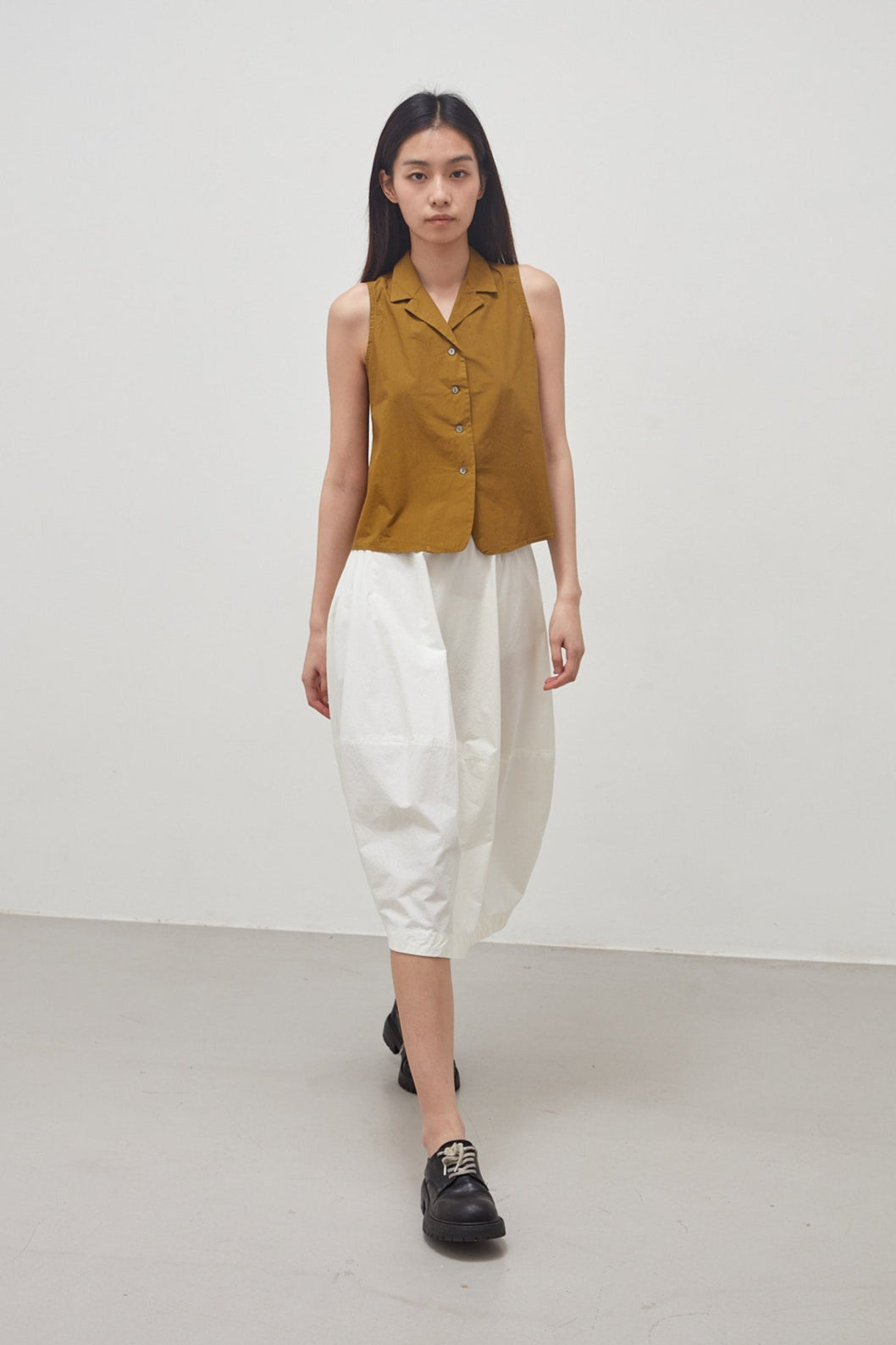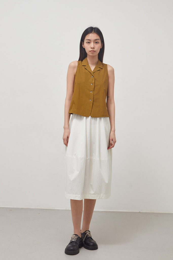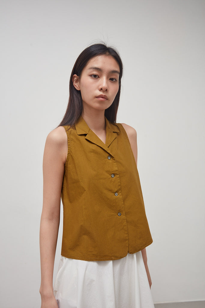 Sleeveless top in crisp, oil-colored, garment-dyed cotton poplin: small lapel collar, fitted armholes, flared cut, central fastening with four small buttons, seam at the center back.