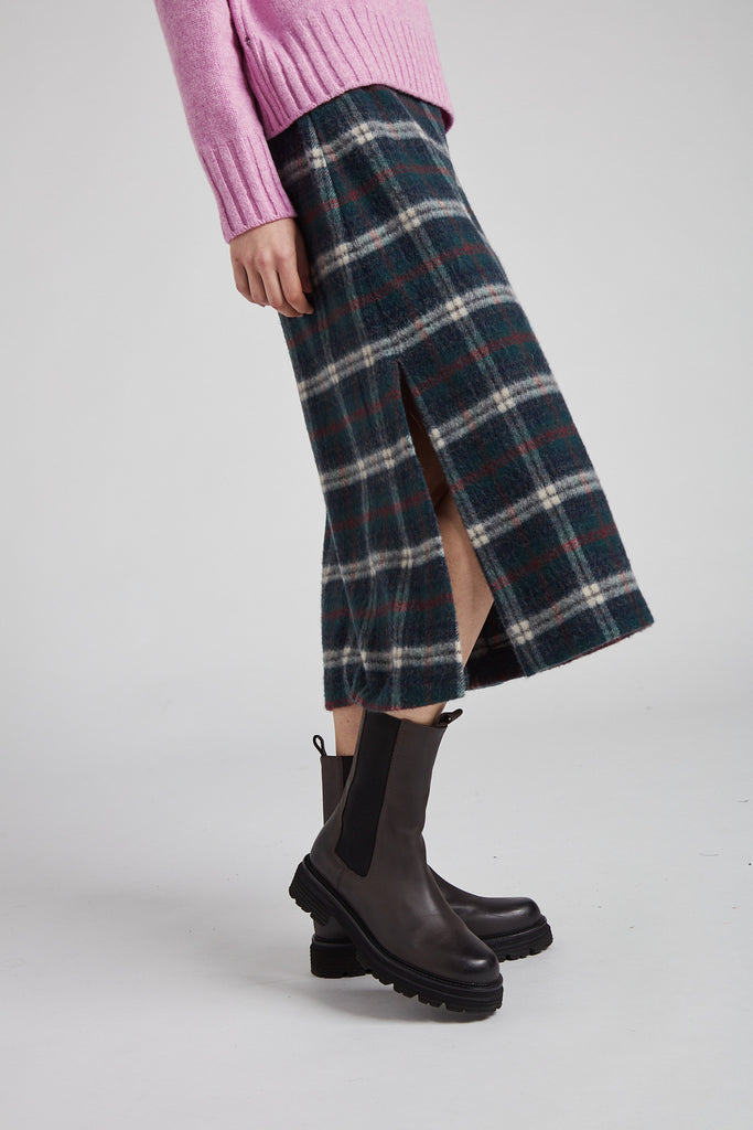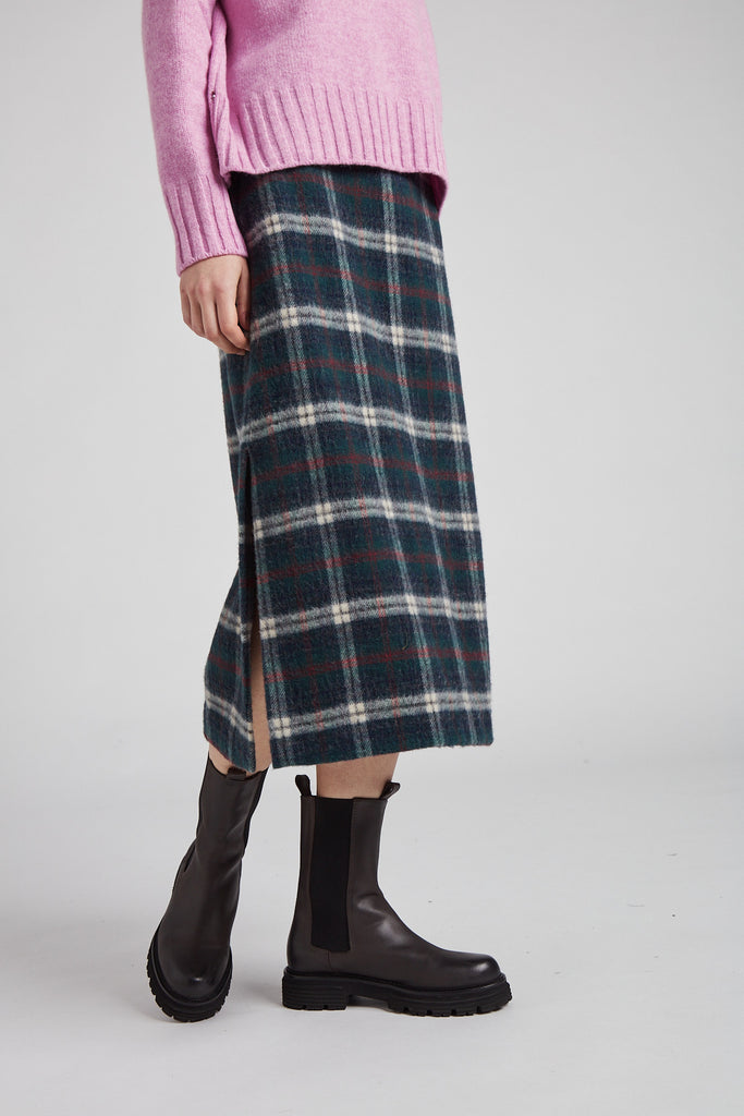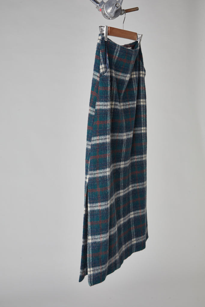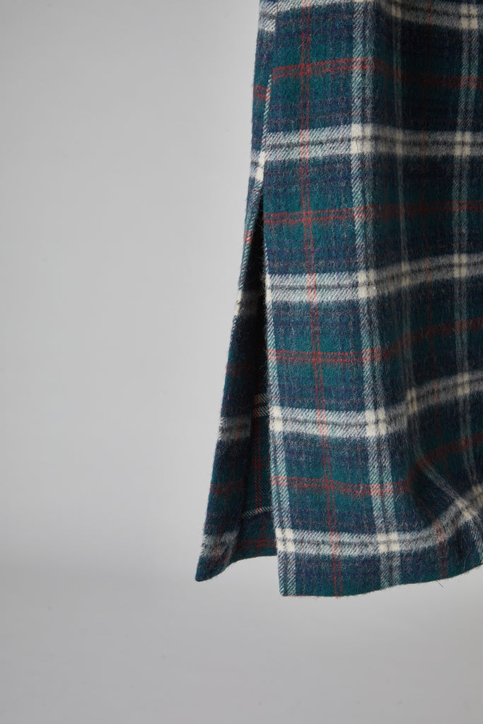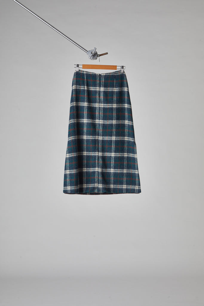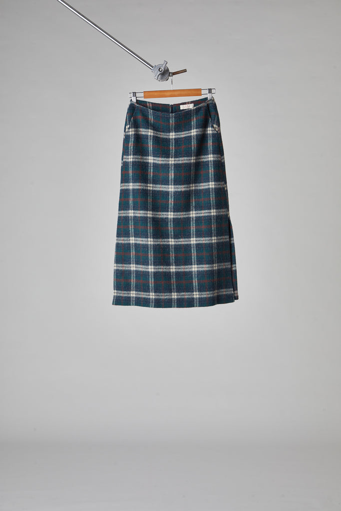 Gonna taglio diritto e leggermente svasata sul fondo, in morbida lana giapponese con mano pelosa, a quadri scozzesi color verde bosco: tasche all'americana sui fianchi, doppio spacco laterale sul fondo, chiusura con zip nel centro dietro, sfoderata e rifinita con orlo alto sul fondo.