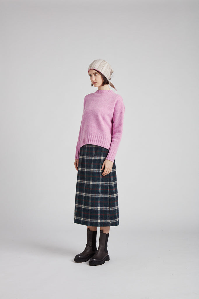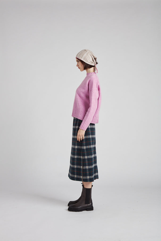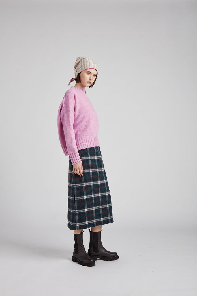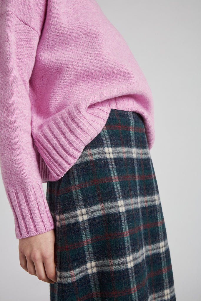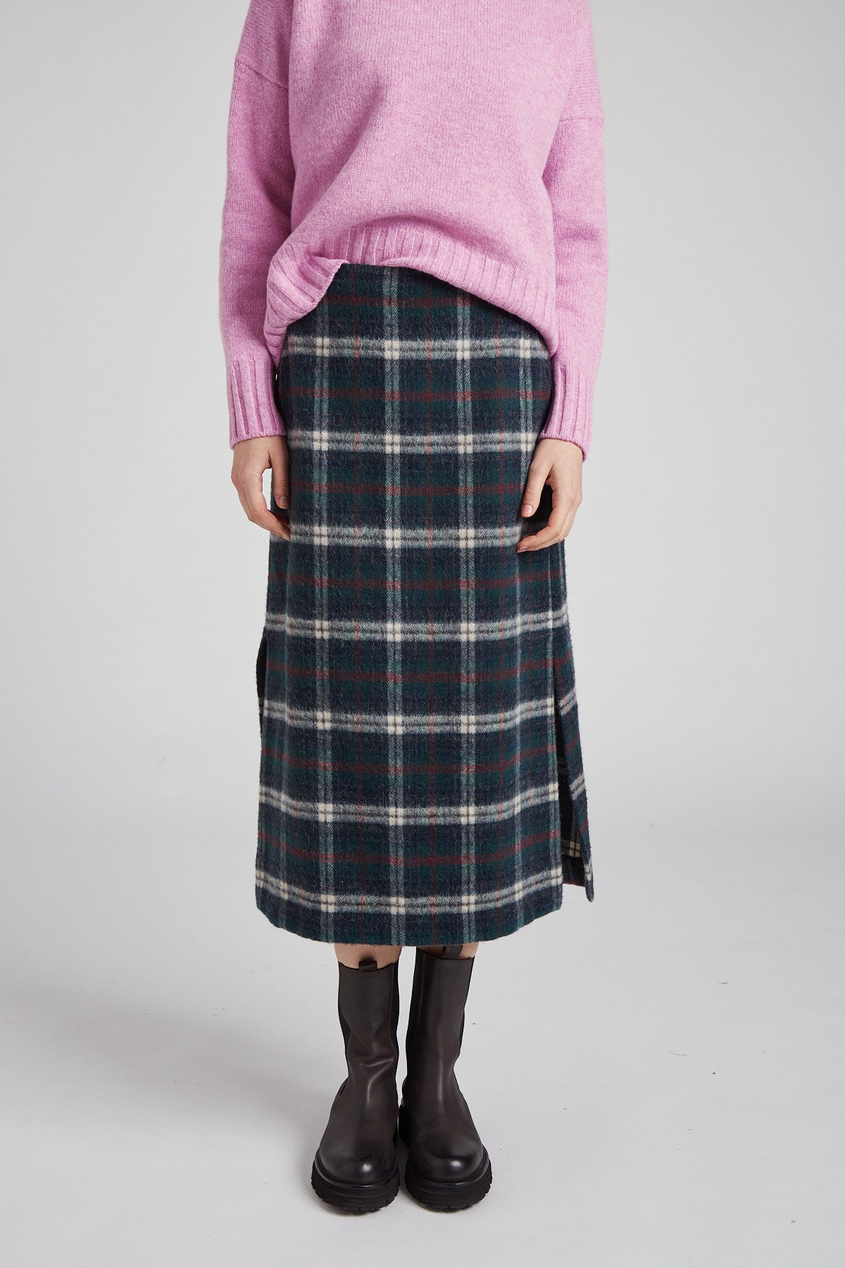 Gonna taglio diritto e leggermente svasata sul fondo, in morbida lana giapponese con mano pelosa, a quadri scozzesi color verde bosco: tasche all'americana sui fianchi, doppio spacco laterale sul fondo, chiusura con zip nel centro dietro, sfoderata e rifinita con orlo alto sul fondo.
