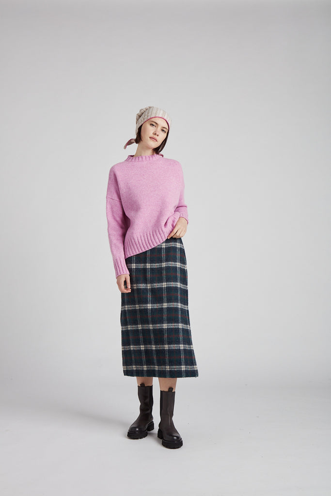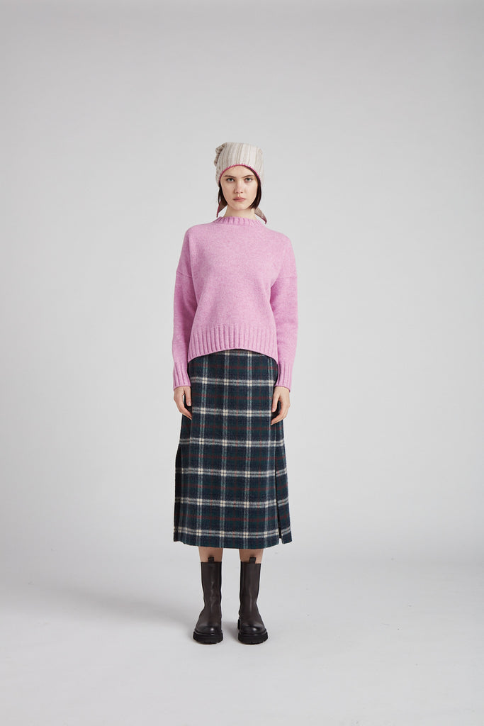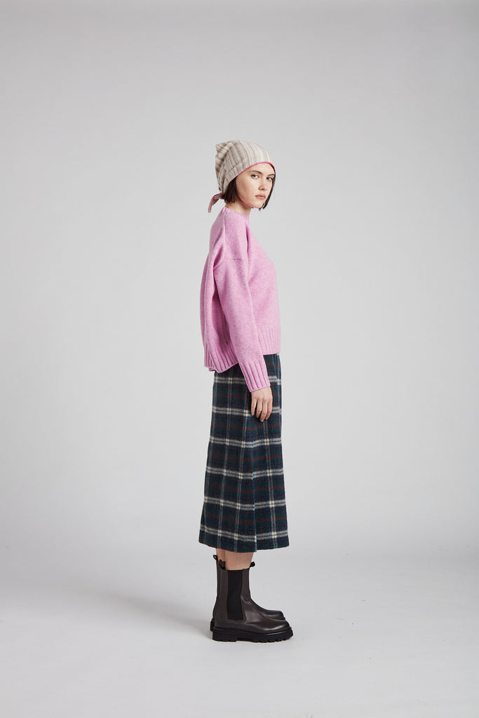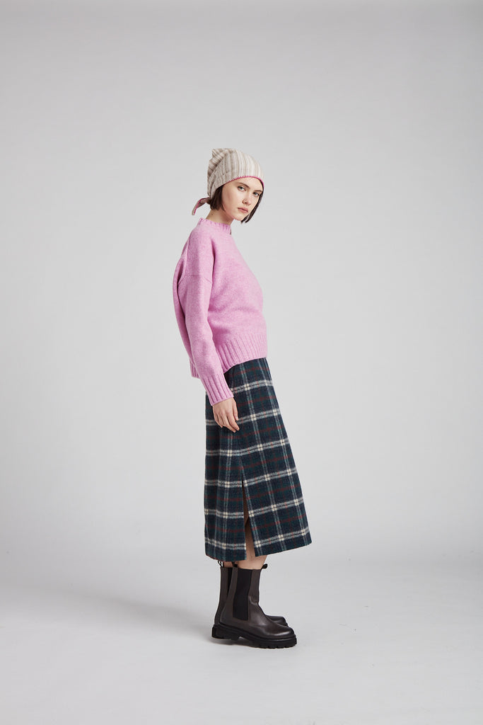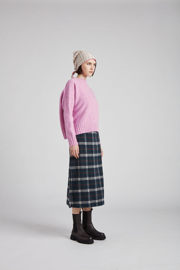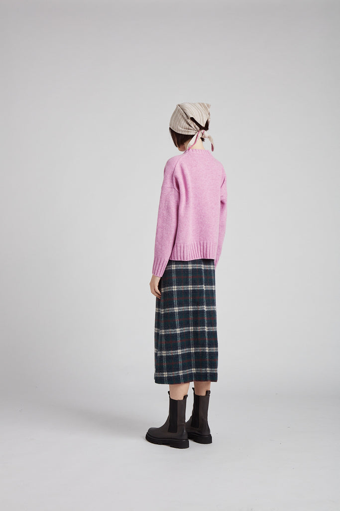 Gonna taglio diritto e leggermente svasata sul fondo, in morbida lana giapponese con mano pelosa, a quadri scozzesi color verde bosco: tasche all'americana sui fianchi, doppio spacco laterale sul fondo, chiusura con zip nel centro dietro, sfoderata e rifinita con orlo alto sul fondo.
